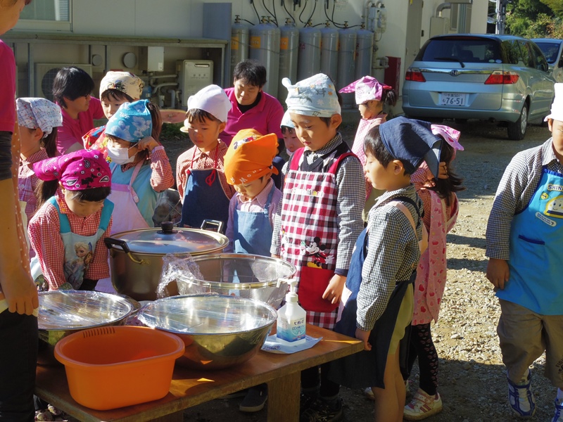 子どもたちが頑張ったお礼もかねて、光の子モンテッソーリ子どもの家のお母さんたちから人形劇のプレゼントがありました。「もっともっとおおきなおなべ」という絵本です。森の中に住んでいる動物たちが森の実りで、シチューを作る物語です。ねずみさん、りすさん、うさぎさん、やぎさん、くまさんが出てきます。シチューを作ってお鍋がシチューで溢れそうになると、次々にお鍋を借りにいきます。最後はくまさんのとてもとても大きなお鍋でシチューを作り、河原でみんな食べます。このお話しは、感謝祭で作ったカレーと重なる部分があり、子どもたちも喜んでいました。