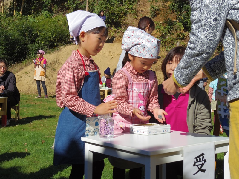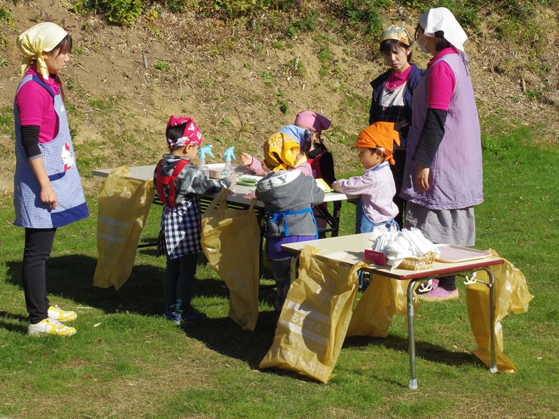 子どもたちは、沢山の作物の実りに感謝して、カレーを作ることにしました。せっかくカレーを作るので、お父さんお母さんや家族のみんなを招待して園庭で青空レストランの「カレー屋さん」を開店することにしました。
