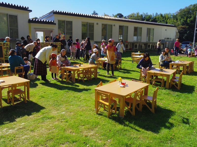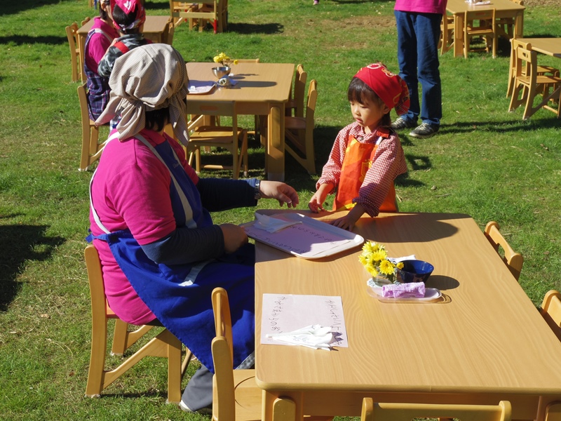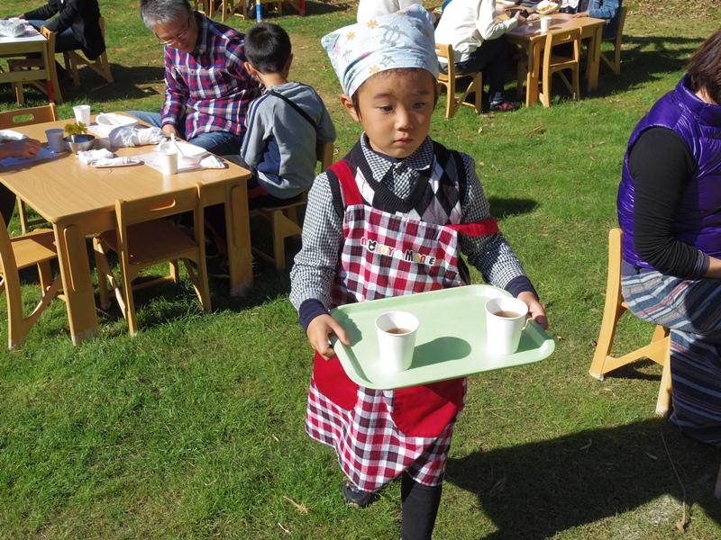 お客さんになったお父さんお母さんは、受付でお金を渡して子どもたちに席まで案内してもらいます。「いらっしゃいませ」「何名様ですか?」「こちらへどうぞ」子どもたちの一生懸命さが伝わってきます。小さな手でお客さんの手をとって、席まで案内してくれます。そしてカレーとお茶を運んできてくれます。こぼれないように慎重に慎重に運ぶ姿に、つい手をかしてあげたくなってしまいますが、ここはグッと我慢をして最後まで見守ることにします。「お待たせしました」「ごゆっくりどうぞ」恥ずかしい気持ちとたたかいながら、そんな言葉やかけてくれました。年少さんたちも、スプーンと紙で手作りしたテーブルクロスを運んできてくれました。恥ずかしくて先生の後ろに隠れながらそっと差し出してくれる子もいたりして、とても可愛かったです。年少さんたちもお兄さん、お姉さんのまねをして頑張っていました。