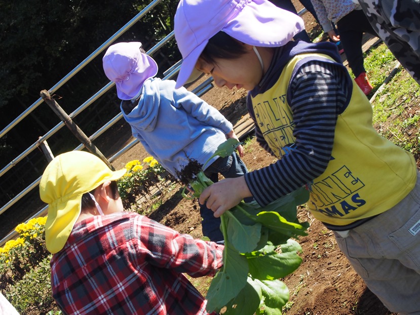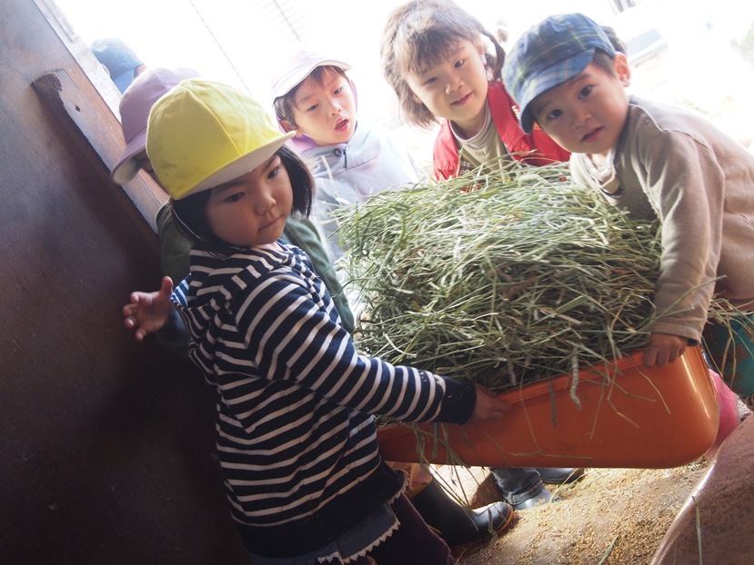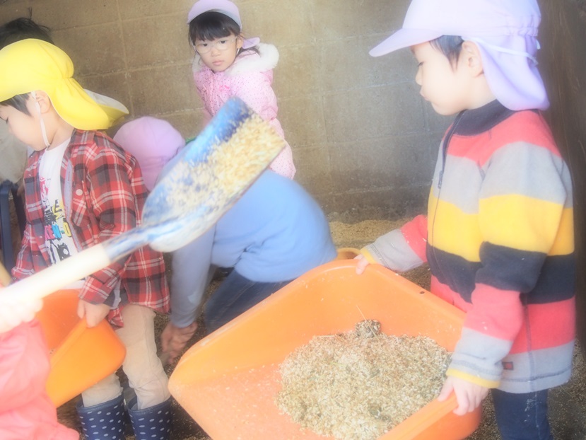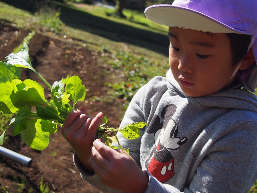 5回目ともなると子どもたちもなれたもので、誰の指示をも待たずに黙々と作業にとりかかります。(これってなかなかすごいことだと思いませんか?自分で考えて行動できるってかっこいいことだと思います。)まず最初に必ずすることは、お馬さんのすばるのお部屋の掃除をすることです。お世話になるすばるに感謝の意味もこめてお部屋を綺麗にします。お馬さんは清潔にしておかないと病気にかかりやすくなってしまうそうです。掃除道具を子どもたち自ら持ってきて、掃除のスタートです。「ここはうんちがいっぱいあるねー」「ここでごはんを食べてるのかなぁ」なんて話しながら、わらを新しいものと交換します。実際すばるはトイレの場所、ごはんの場所など、1つの小屋の中で自分でスペースを決めて生活しているみたいです。子どもたちの観察力はすごいですね。いろんなことを発見しています。キッズフォークを始めた頃は、掃除するのも抵抗がある雰囲気でしたが、今ではすばるのうんちも素手で持てるようになっています。うんちの取り合いになるというおかしな状況になっていました。草食動物のお馬さんのうんちは草が主成分なので触っても問題ないそうです。テキパキと掃除を終えて、次は1か月前に、子どもたちが自分たちで種をまいた小松菜の収穫です。青々と美味しそうに育った小松菜を手で抜いていきます。土の匂いもしてきます。小松菜の根っこを見るのは初めての子どももいたと思います。自分で種をまいて、収穫して、食べるという食の流れも知ることができました。自分で収穫した小松菜を美味しそうに、自慢げに食べていました。かわいいですね。