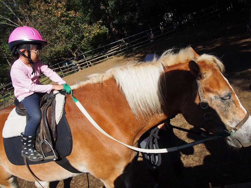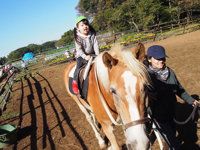農業体験の後は、すばるに乗馬します。年少、年中さんは、たずなをひいてもらって乗せてもらいます。すばるのリズムに合わせて子どもたちの体が上下に揺れています。今回、年長さんは、1人で乗ることに挑戦しました。「進め」の合図と「止まれ」の合図を教えてもらいいざ本番です。乗馬用の帽子を被って、たずなを自分でもって、すばるに乗ります。緊張していたけれど、何度か挑戦しているうちに、全員1人で乗れるようになりました。子どもたちも自分で成し遂げられて、自信がついたと思います。