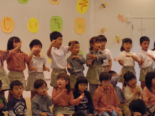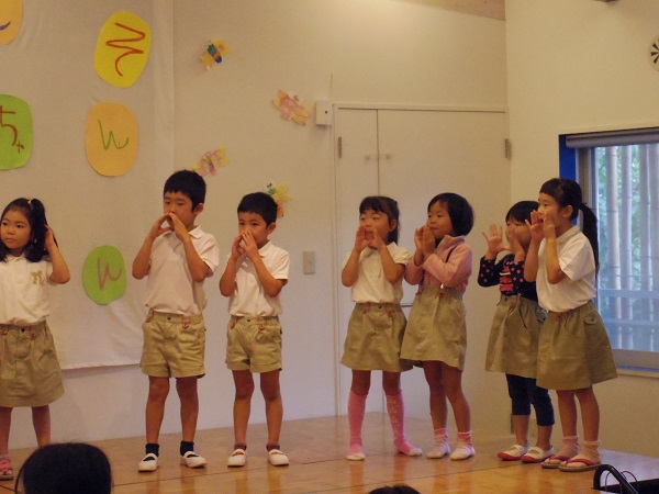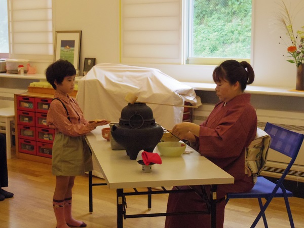 大好きなおじいちゃん、おばあちゃんを招待してお茶と歌のプレゼントをしました。お抹茶とお菓子のお運びは年長さんのお仕事です。みんな「おもてなし」の心を忘れずに丁寧にお茶とお菓子を運んでいました。小さな手から渡されるお茶の味は、きっと優しい心が温まるものだったと思います。