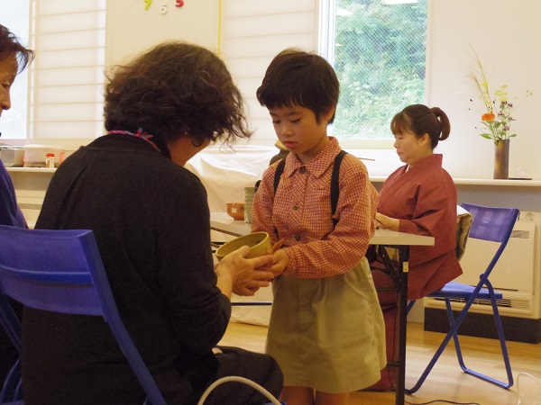 年長さん達は、友達やお茶をたてている先生の動きなど、周りの様子を見ながら自分の出番を待っています。みんな堂々としたもので、上手にお運びをしていました。「お菓子をどうぞ」、「お茶をどうぞ」、「おさげします」と自分の仕事の内容をきちんとわかっていて、その都度適切な声かけをしていました。全てのお運びの仕事が終わり、開放された時の子ども達のほっとした顔を見て、「緊張しながらも頑張っていたんだな。」と感じました。