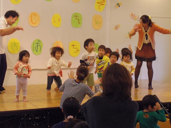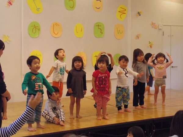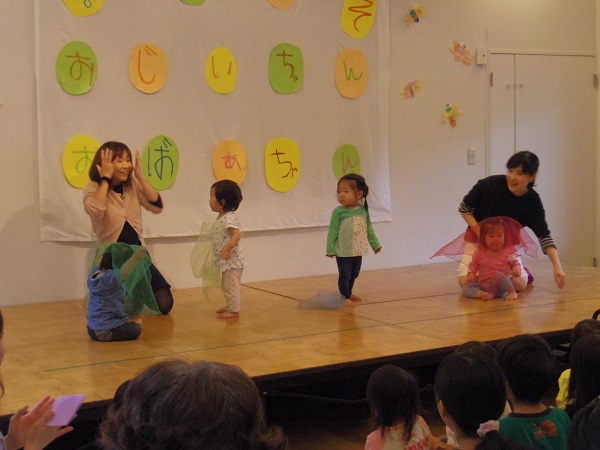お茶のおもてなしが終わると、お次は園児全員で歌のおもてなしです。年齢の小さいクラスから順番に発表してくれました。0、1歳のお友達はステージに上がるだけで、すでに可愛いです。リズムに合わせて体を動かしてくれました。2歳児さんは、音楽に合わせてジャンプをしてくれました。3、4、5歳児さんはいくつかのグループに分かれて、入れ替わりでかわいい振り付けをしながら歌を聞かせてくれました。最後は3、4、5歳児さん全員で歌をプレゼントしてくれました。子ども達のピュアな歌声で皆さん癒されたことと思います。ステージにいる我が孫を笑顔で見守っているおじいちゃん、おばあちゃんの姿がとても印象に残っています。そんな皆さんの事を私も笑顔で見ていました。最後に、おじいちゃん、おばあちゃんに子ども達から心のこもったプレゼトを渡しました。みなさん大事そうに優しい笑顔で受け取ってくれていました。今年の敬老祖父母会も大成功で終わることができました。