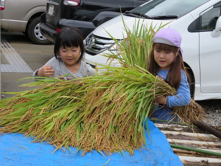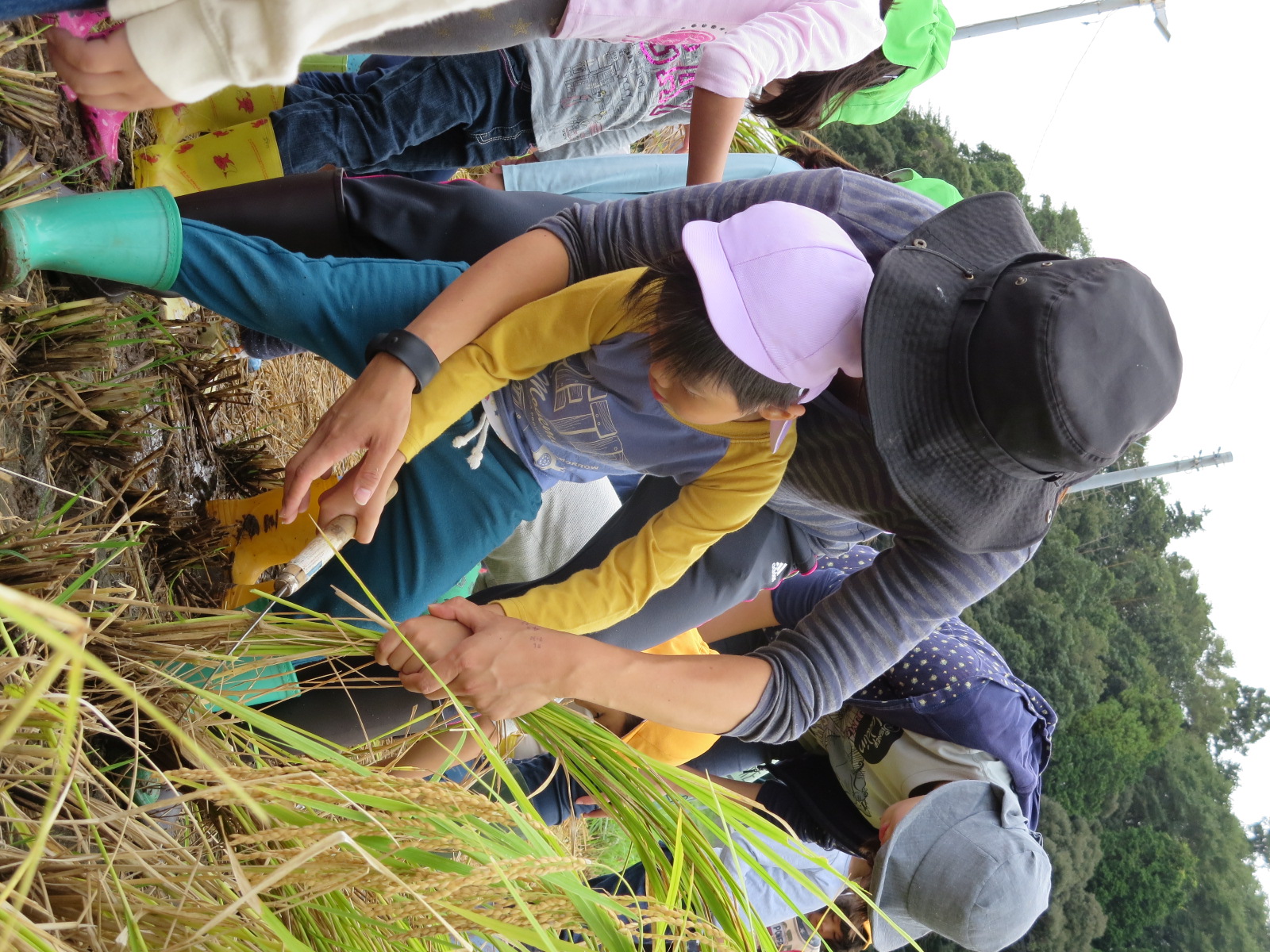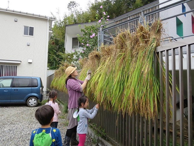 年上の子ども達は稲刈りから最後の干すところまで、自分から進んで作業を手伝う姿が目立ちました。鎌で刈る感触や、作業がだんだん進んでいく事にやりがいを感じているようでした。そんな様子を見て、成長したなぁ。。。と感心します。