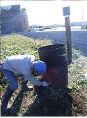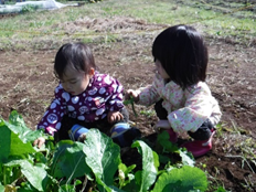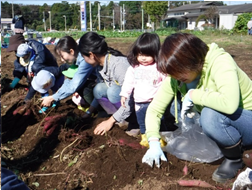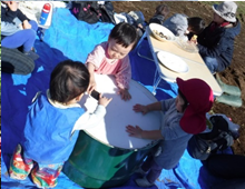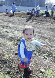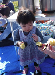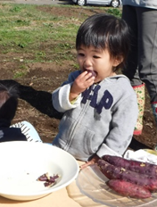 そんなノアに、今回新イベントとして登場したのが「芋掘りピクニック」です。千代田地区にある「千代田壮」横に、今回芋掘りをした畑があります。福祉農園グレイスファームの管理している畑の一つで、たくさんのサツマイモの蔓が伸びていました。嬉しそうに芋掘りをするママたちの横で、なんだかわけもわからずにいる子ども達。でも、お芋が出てくると、ぱっと表情が変わって、「わぁ!」「大きなおいも!」。たくさんのりっぱなお芋がとれました。隣の畑では、雑草に交じってナバナがたくさん生えていました。ママたちが今夜のおかずの一品にと収穫にいそしんでいる横で、子ども達は広い畑で楽しそうにただ歩き回ったり、一緒に収穫の喜びを感じたり、初めての場所や広い空間にすっかり腰が引けていまって固まってしまったり。でも、石焼き芋が出来上がるとみんなすっかりリラックス。いつもはあまりサツマイモを食べない子も、喜んでハフハフと出来立てのお芋をいただいていました。