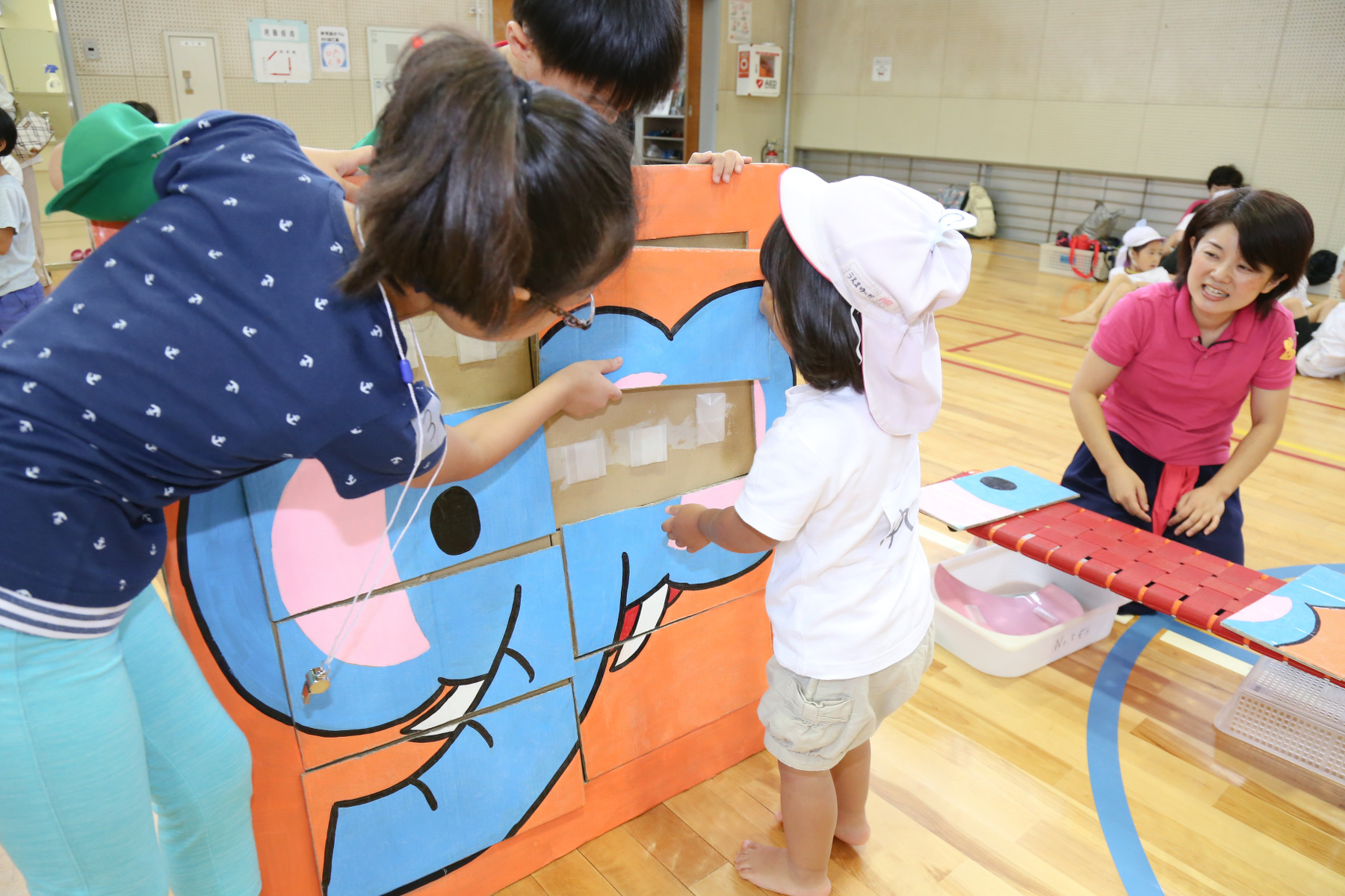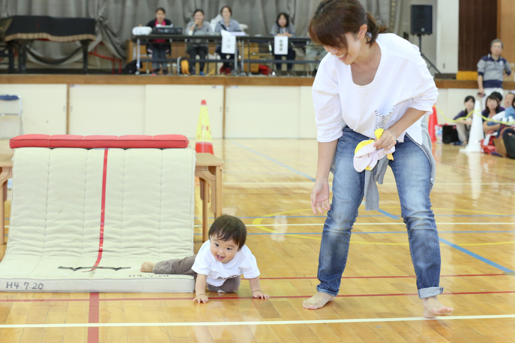 何人かの先生方が2階から、カブトムシキャンディーを投げて、それを手をつないだ親子で取りに行く。という親子競技です。