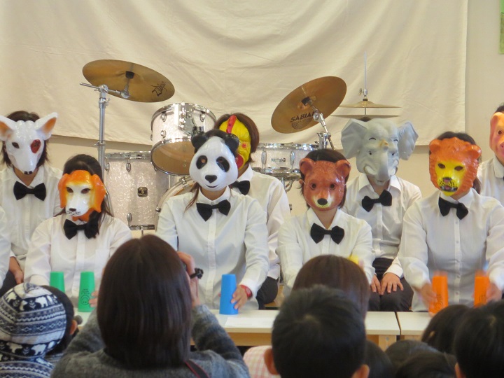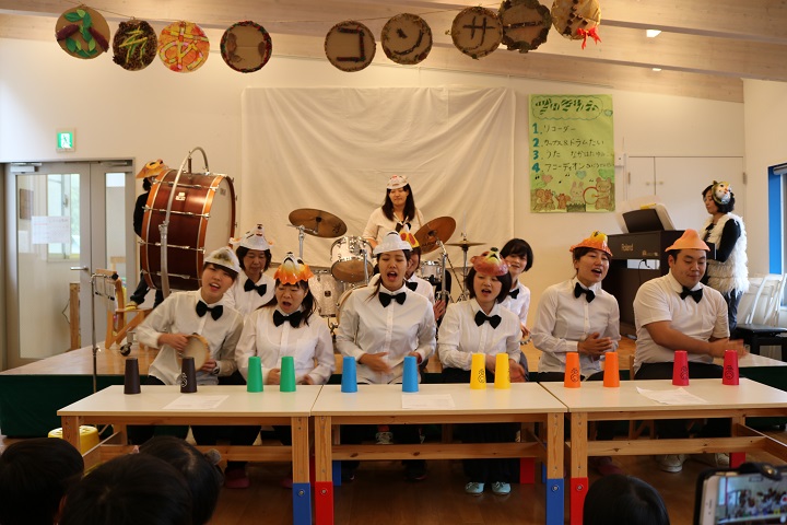 カップをテーブルに置いた時の音、カップ同士がぶつかり合う時の音。をうまくリズムにのせて、ドラムやエレクトーンに合わせて演奏します。