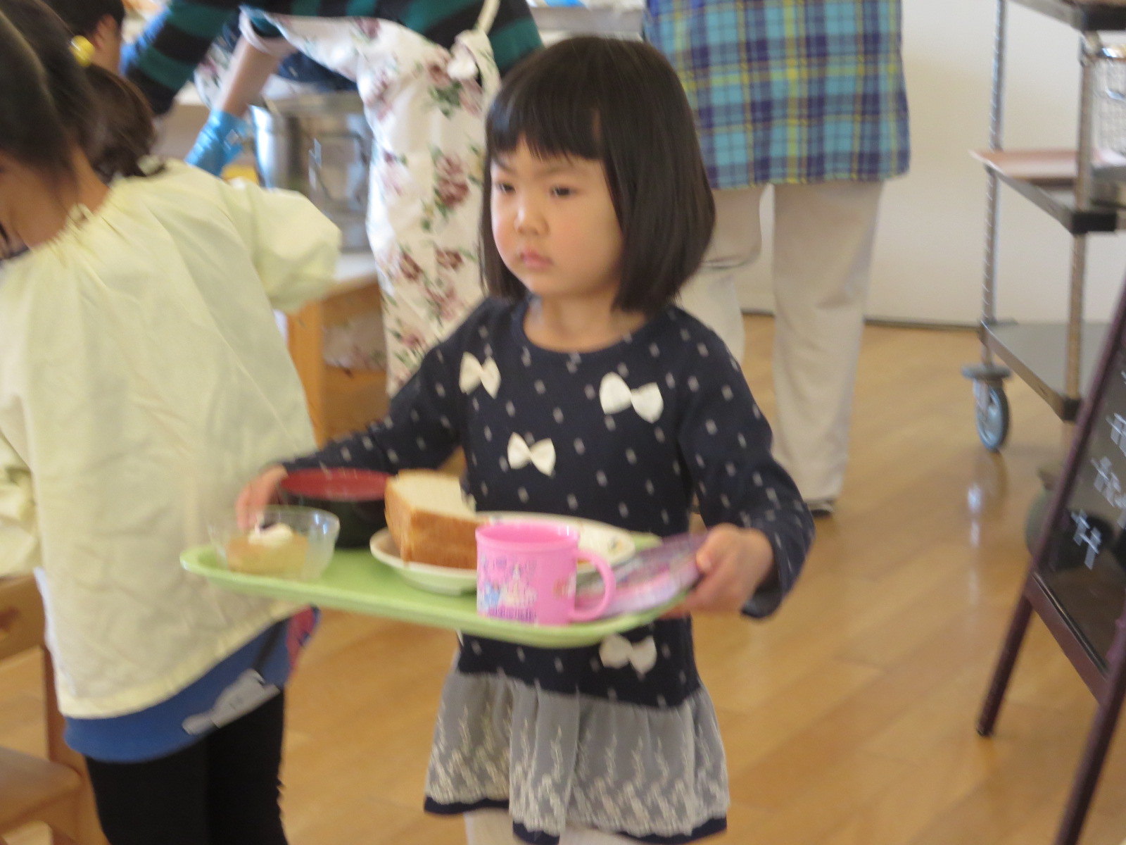 もっと小さい、はと組さんの子ども達は、まだ何の抵抗もなく、配られた鶏肉をもぐもぐおいしそうに食べています。