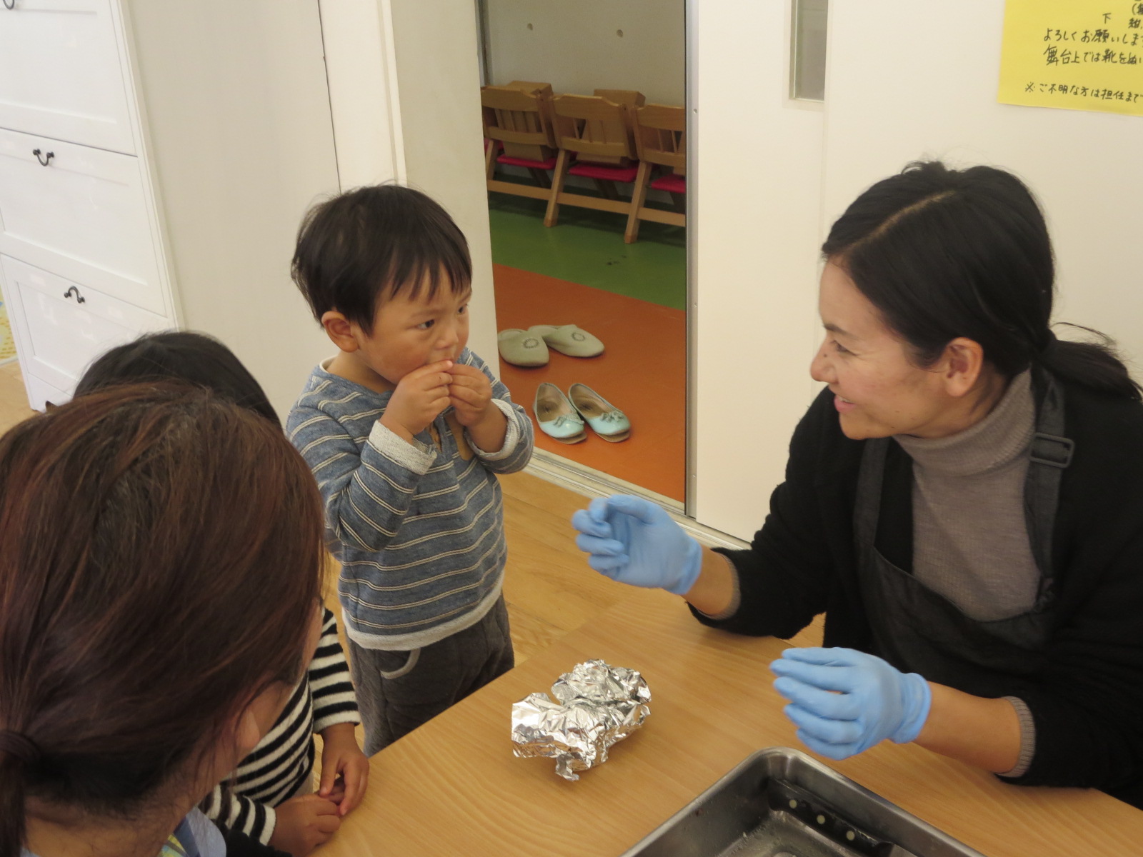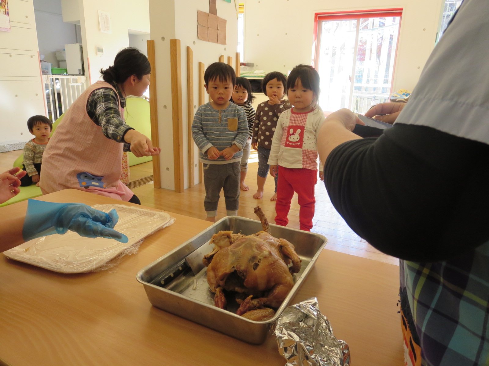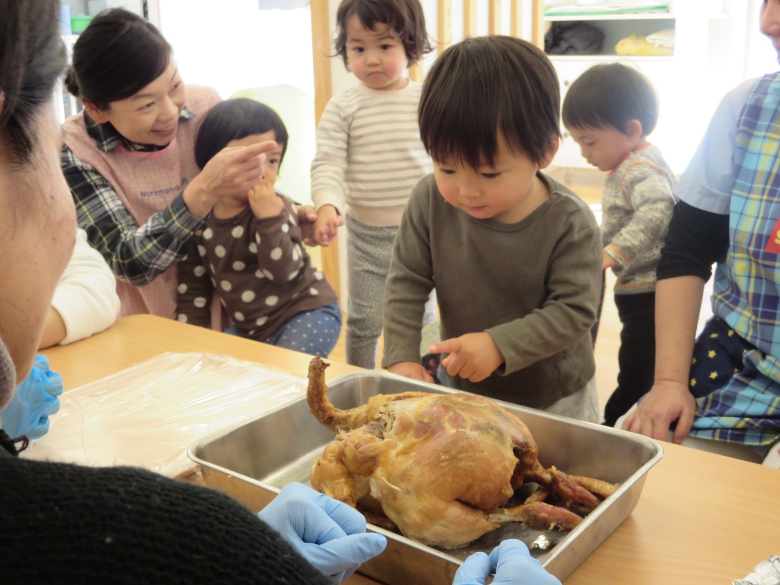 1・2歳児のにじ組さんたちは、チキンの丸焼きを見ただけで、初めはギョッ!とした様子。
