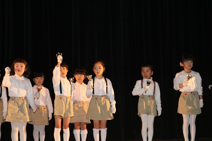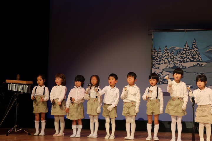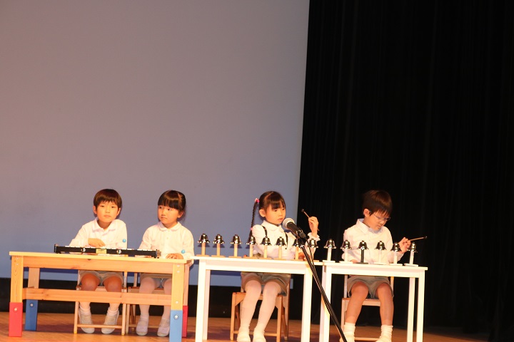 年長児さん全員で、鈴、ハンドベル、ウィンドウチャイム、鉄筋、ミュージックベルを使って演奏しました。キラキラと優しい演奏でした。