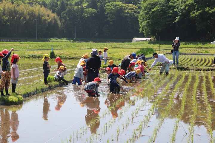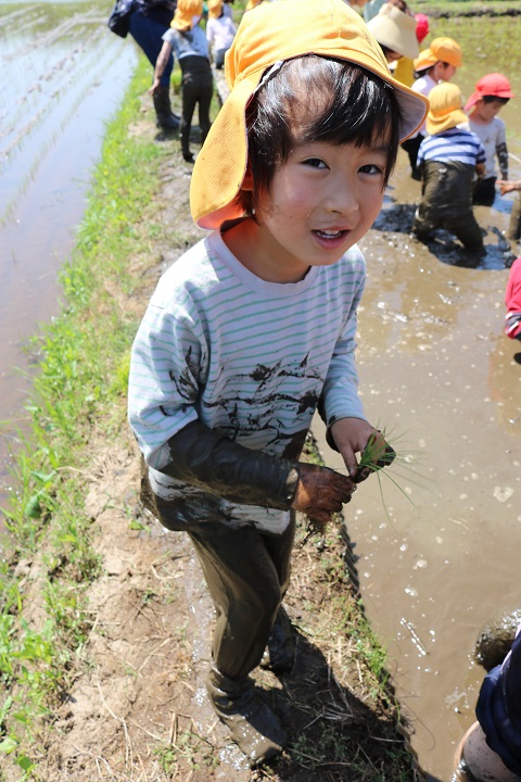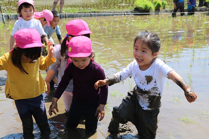 ピンクちゃん(年少さん)からは、実際に田んぼに入って田植えをやらせてもらえます。