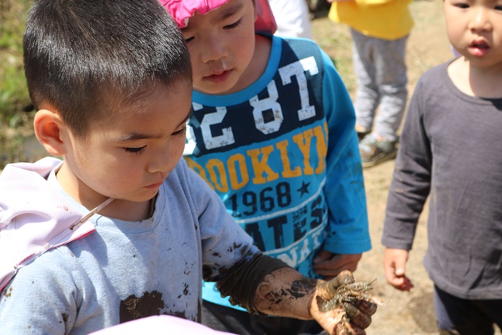 周辺の草をむしったり、ザリガニを捕まえたり、水路の水でバシャバシャしたり