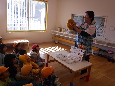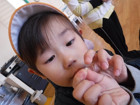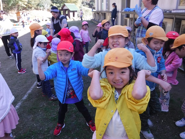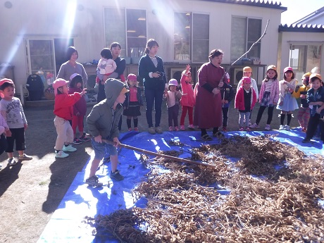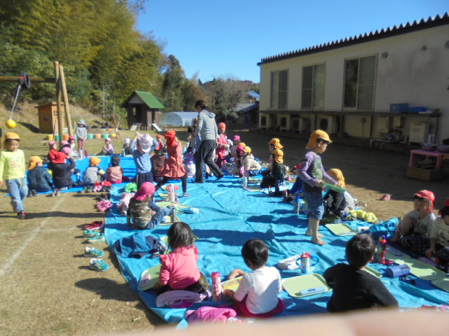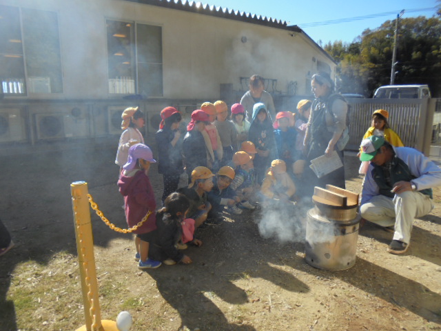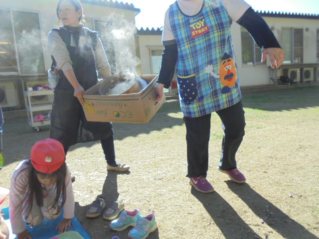 黄色さん(年中さん)、ピンクちゃん達(年少さん達)は、焼き芋の準備です。