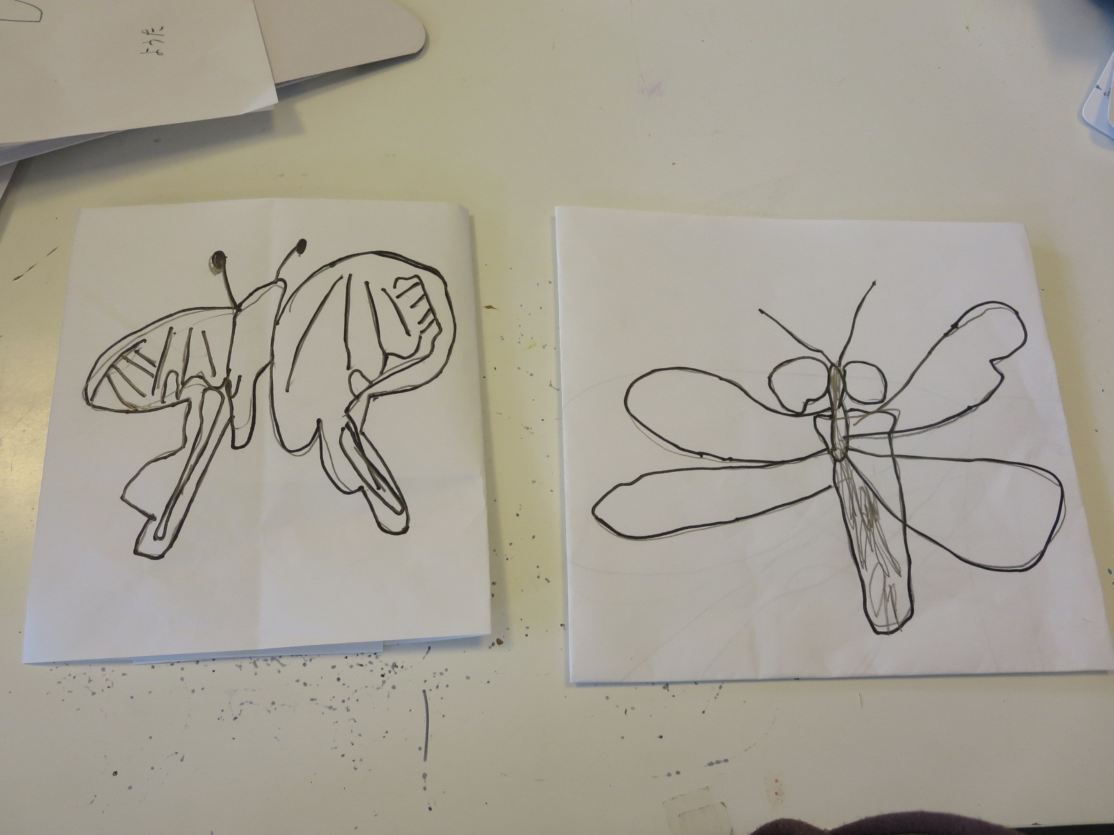 子供たちが、昆虫図鑑と海の生物の図鑑の中から気に入った写真を選び、画用紙に描きました。