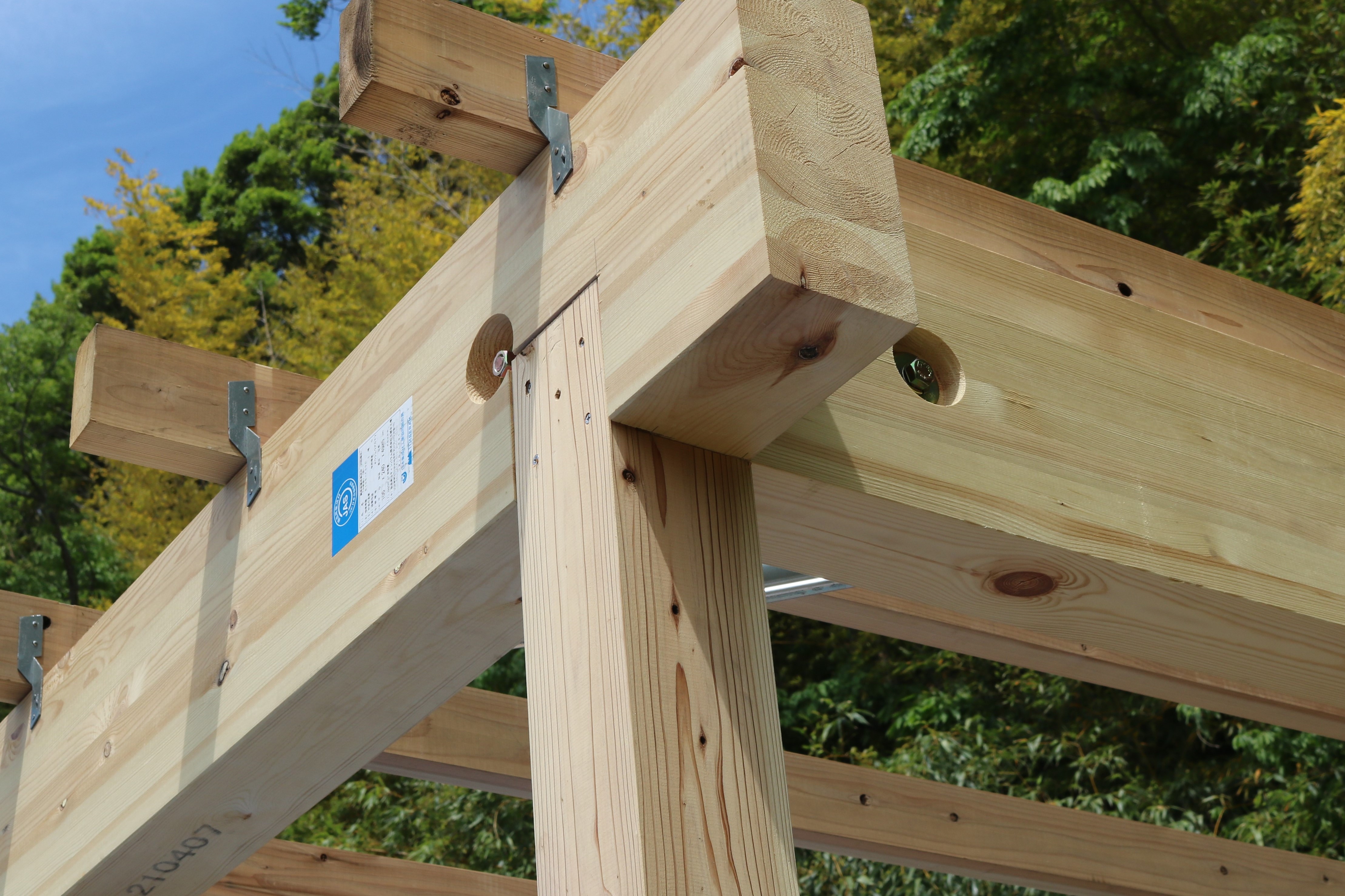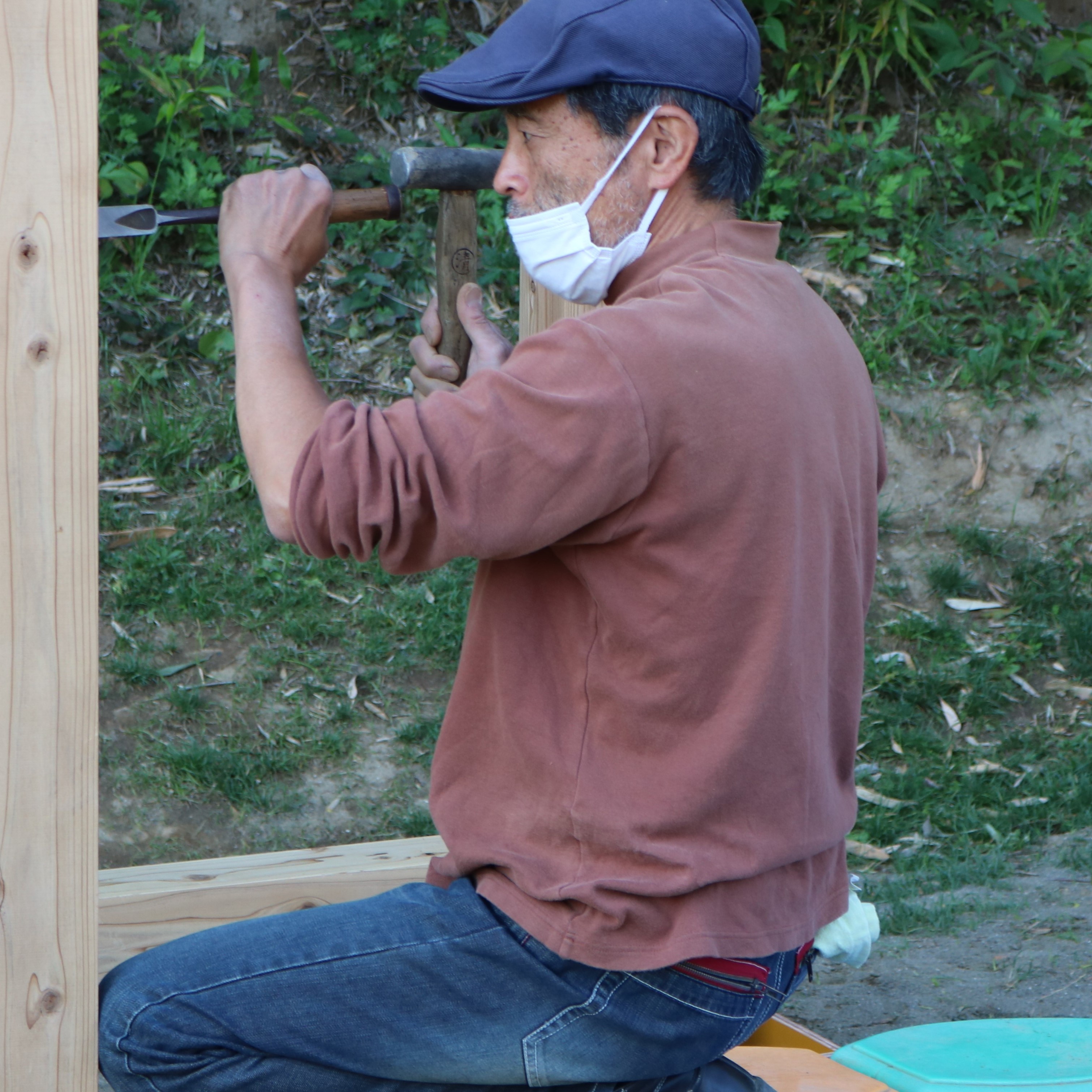 朝は8時に集合。今日は午後から、M先生とMS先生が応援に来てくれると言っていたので、それ までに、墨付けした材料を切ってしまおうと、2人の親方たちは話していました。休憩時に話している お二人の会話は、専門用語と尺貫法で寸とか㎜での話だったので全く話に入れず、ぼーっと耳を傾けて いました。材料が予定より早く準備できたので、10時過ぎには、柱を立て始めました。