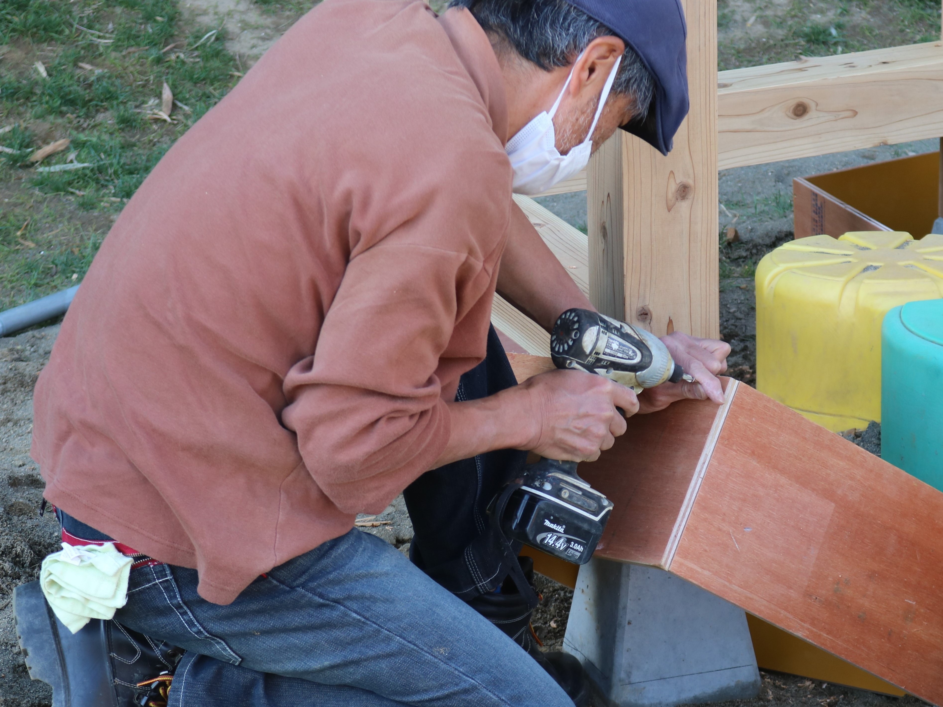 柱が立ったので、今日からT親方一人で作業が進められました。朝はいつも8時に集合して、すぐに始められました。私に親方は、各柱12本を梁と沓石に上下5本ずつのビス(75㎜)をインパクトドライバーで打ち付ける作業を頼まれました。初めの何センチかはスムーズに入るのですが、途中から柱が固く細長いビスなので、頭が全部なめてしまいそうなので、断念して、親方にヘルプを求めると、難なく意図も簡単に押し込んでいました。(さすがプロ)と、思いました。(たぶん私が下手くそなだけー)(;´д`) 暫くすると、Uくん、Sくん、Aくんとお母ちゃんが駆けつけ手伝いに来てくれた。まあ、3兄弟は持参のボールや凧で遊び始めるのだが、「・・・連休なのに大事なお父ちゃんを借りちゃってごめんねー」と、思いつつ、ボール、ターザンロープ、凧で、一緒に遊びの相手をしている私でした。今日は日曜礼拝がホールで行われていて、親方はしきりに音がうるさくならないことを気にしていました。お昼休憩が終わった後、園庭側のペンギンの外出口のサッシを子どもたちのトイレ対応の為に開けておいたのを思い出して、すでに ALSOKの警備の施錠は、礼拝後に、園長先生がして帰られただろうと思い、ペンギンのサッシの鍵を閉め、ALSOKの警備の施錠を1度解除して、もう一度施錠をし直した所、どういう訳か警報が作動してしまったらしく、ALSOKの人が警察に連絡して、数人の警察官を引き連れ、「なにしているんですか?」と、聞いてきました。ALSOKの人は、「あなたの身分を証明するものはありますか?」と、聞いてきて園長先生に携帯で連絡をしながら、「加藤さんという人と今接触しているんですが、職員んですか?」と、聞いていました。それはまるで私は事件の犯人か何かのような扱いで、ちょっとムッとしました。 ”なんだよ~作業しているだけなのにーと、” その後、園長先生と連絡を取り事情を説明しました。この日も空は不安定で、午後から黒い雲がモクモクと沸き初め14時頃には、「ポツポツ、ザー…」と降ってきて作業は一時中断し、様子を見ました。作業は、柱に鑿(のみ)で溝を掘って、角の柱とその横の柱に3寸5分の角材を補強の為にはめていく、ちょっと時間のかかる作業でした。下の方8本、下から100センチくらいの所に8本、合計16本を、鑿で溝を掘って、角材を切ってはめていくのは、大変です。途中で、上の位置をどうするか?鉄棒はどうするか?階段は?などと悩みつつ時間がたち、今日は、下だけやって早めに終わりにしました。