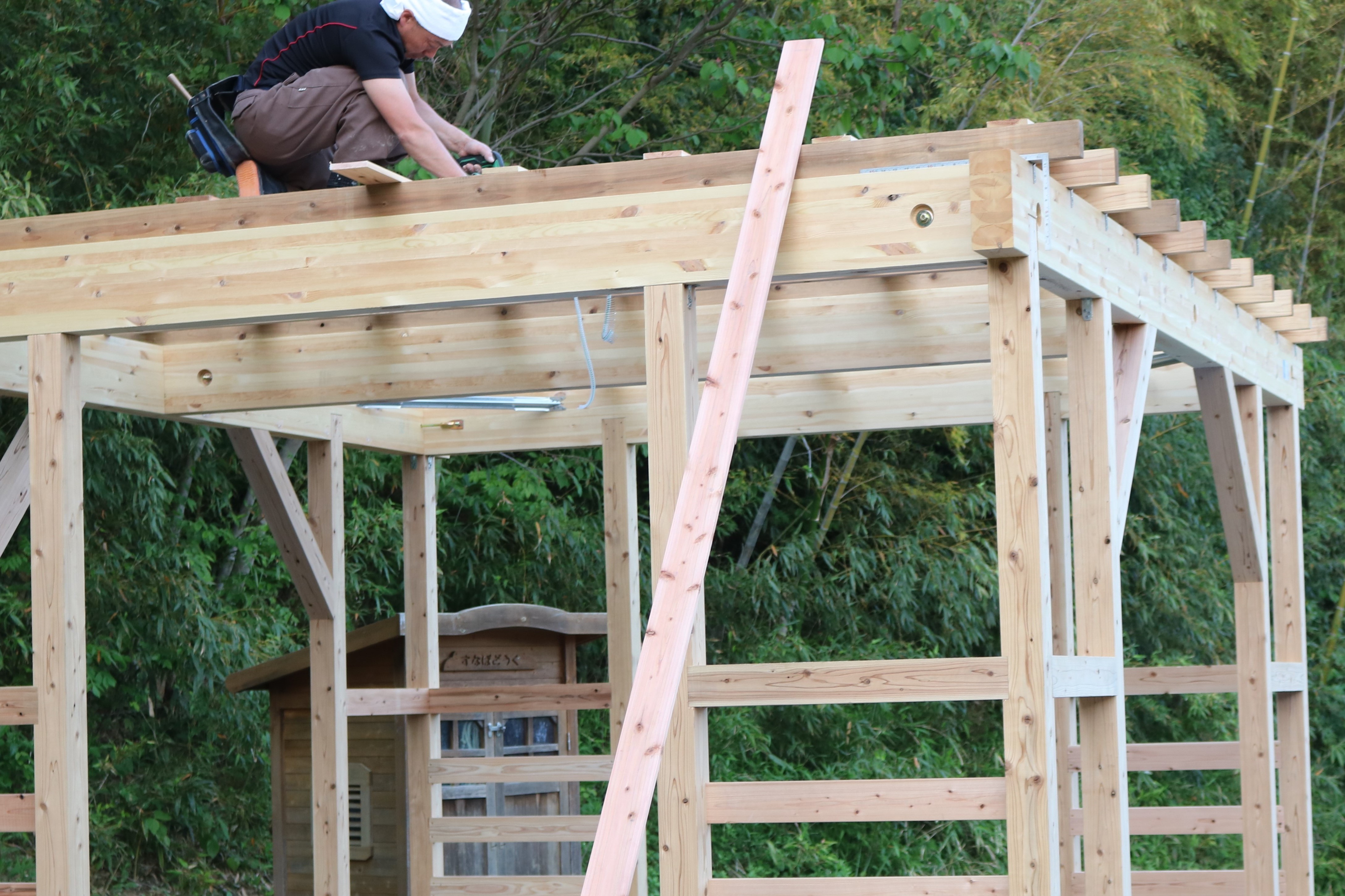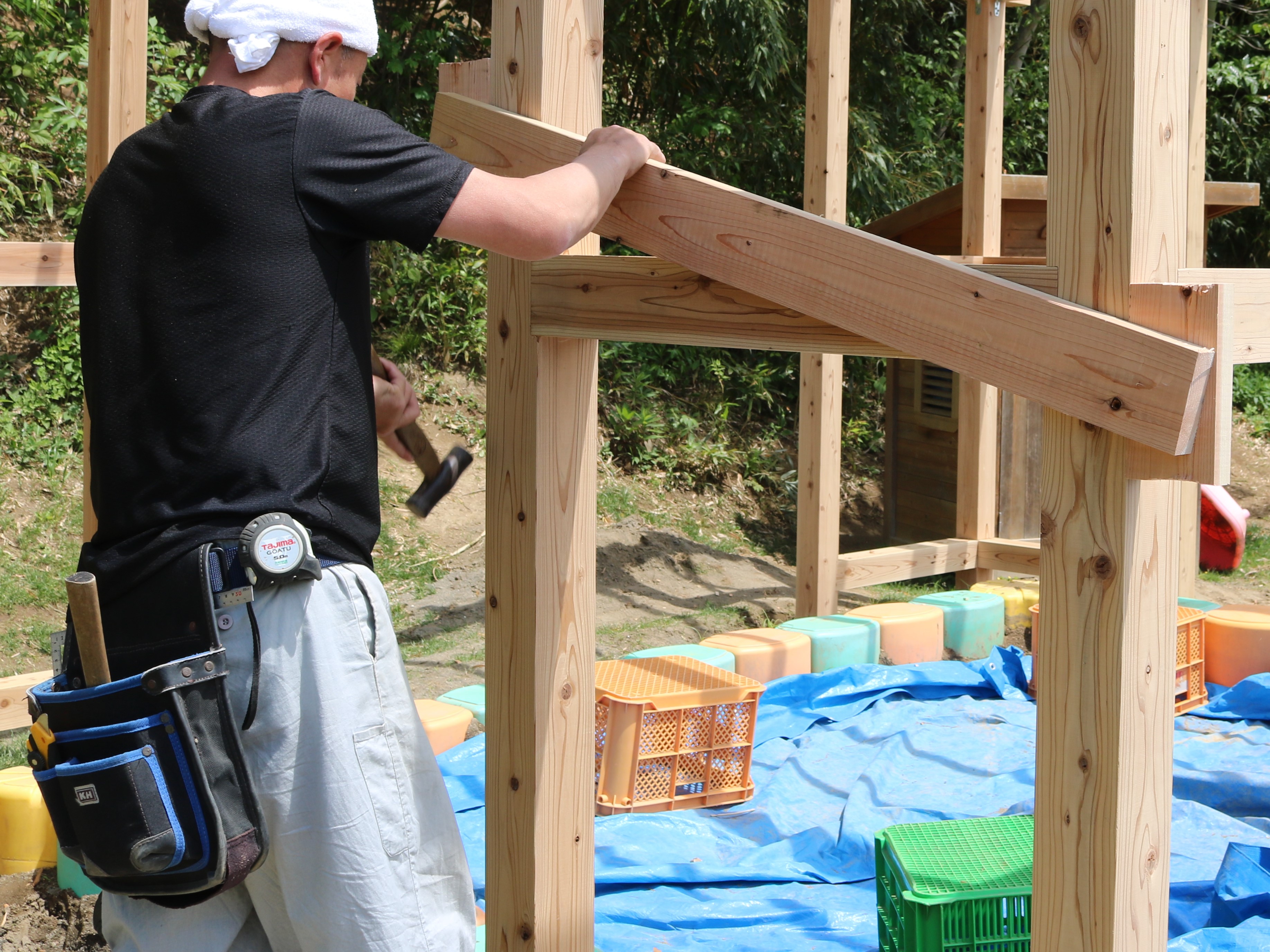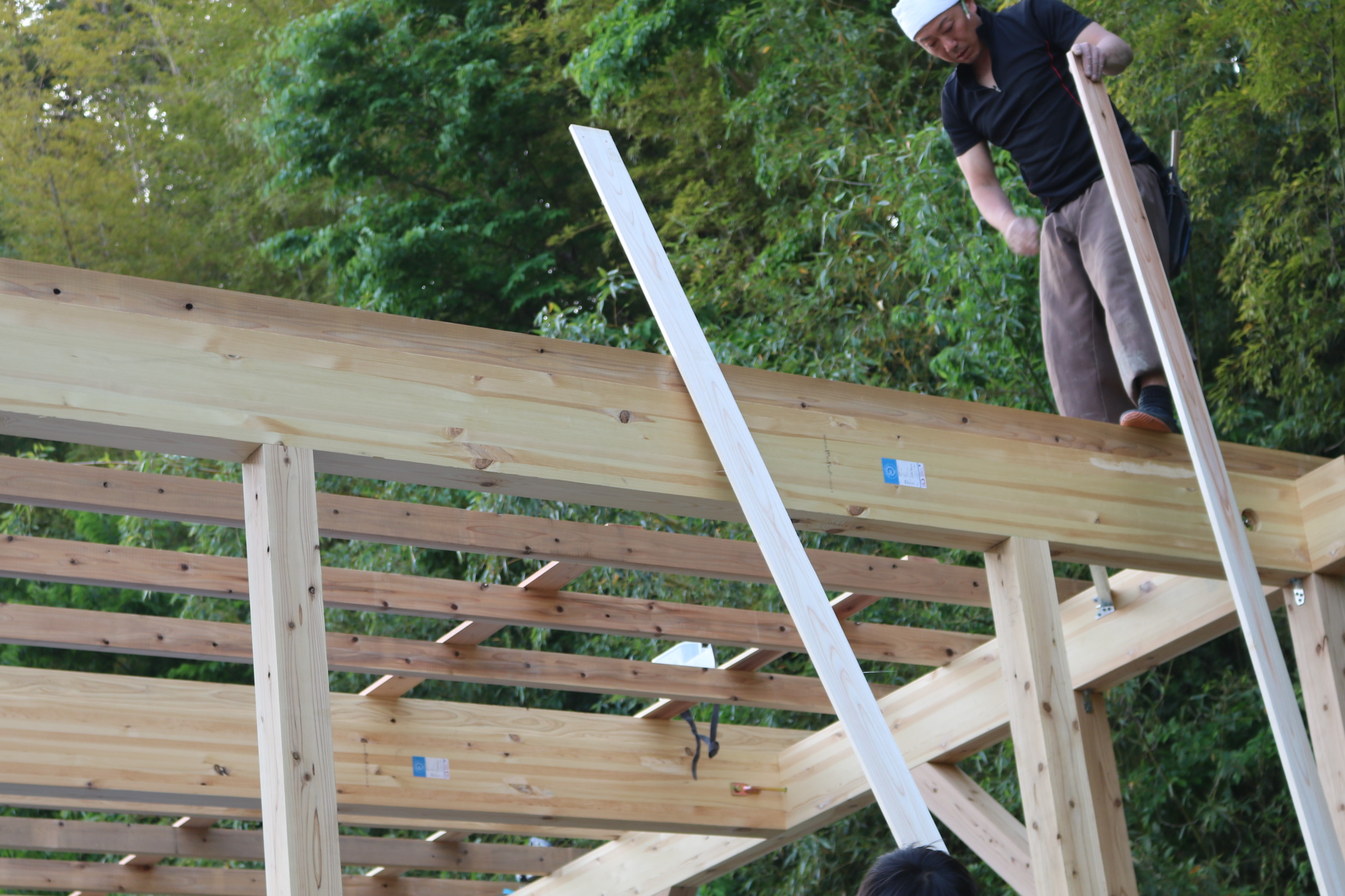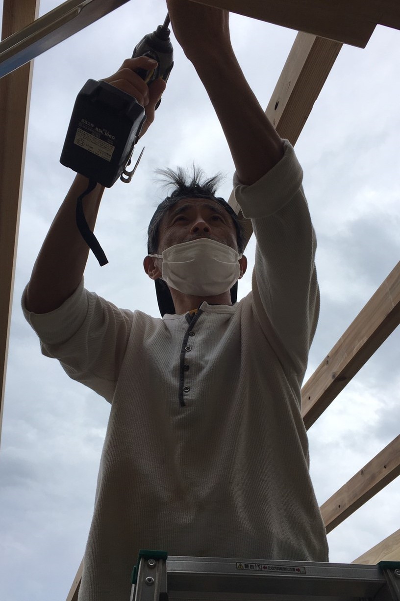 沓石に柱を立て、ビスで仮に打ち付けた後、仮すじかいを2本縦と横に柱につけ、地面に安定するようにたてました。四つ角の柱の内2本の柱を、筋交いを周りに付けてバランスよく立てた後、梁(はり80キロくらいある)を2人で2つの脚立を使って、1度脚立の上まで乗せ、「せーのー!」で柱に組み付けていきました。「ありしぐち」という方法で、掘った溝にゴムハンマーで叩きながらはめていきました。重い材料を上まで持ち上げる作業は慎重に、無理しないように、片方ずつ上まであげました。同じように向かいの四つ角の2本も立て、80キロの梁を、脚立を使って横にはめ込みました。横に渡してつけてある仮筋交いは安定して危なくなくなるまで付けたままにしておきました。後の2本の横の梁も、「ありしぐち」と称する方法ではめ込んでいきました。次に四つ角の柱と柱の間に2本ずつ柱を立てていきました。その柱を立てるのは、O親方が、垂木(たるきー屋根にあたる横に渡す材料の木)を上に登って付けていくのを、T親方が担当し、2人分担して作業が進められて行きました。T親方は、梁の上をサーカスの芸人のように垂木の材料をバランスよく手に抱え、まるで普通に地面を歩くように、皆の頭の上をスタスタと渡っていました。(お~これぞプロの大工さん)という感じです。相好しているうちに、M先生、MS先生、2人の応援隊が駆けつけてくれていました。「わたしたちにできることあるのかしら~」と言いながらやってきました。きっと3人のおじさん達の頭に浮かんだのは、「いいんだよ、何もしなくても、いてくれるだけで、嬉しいんだよ❤」と、思っていたことでしょう。えっ僕だけ⁉ でも、垂木と梁を繋ぎとめる‘ひねり‘という金物を釘で打ち付ける為、脚立に乗らないと作業ができないので、それを押さえる係を手伝ってもらいました。Nさんも、頑張って打ち付けていました。「わたしもやってみたーい」と、言うので2人にもちょとやらせてもらいました。私は、柔らかい木に叩いた釘が入っていく感触を、「‘木‘も生身でいきているんだな~大切にしなきゃあ」と、感じながら打っていました。えっ僕だけ⁉ M先生は、「なんで真ん中に柱を立てないの~?」と、大黒柱的なものを想像していたようで、とんちんかんな事を言って、親方たちを笑わせてくれました。と、突然空模様が急変、黒い雲と共に、激しい雨と雷。”当地方に竜巻注意警報が発令されました”作業中断、今日はこれで解散となりました。次の日に、遊びに来ていたそうすけくんが、昨日「虹を見たよ~」と言っていたので、夕立の後16時半から17時の間出たようでした。”え~僕も見たかったな~”