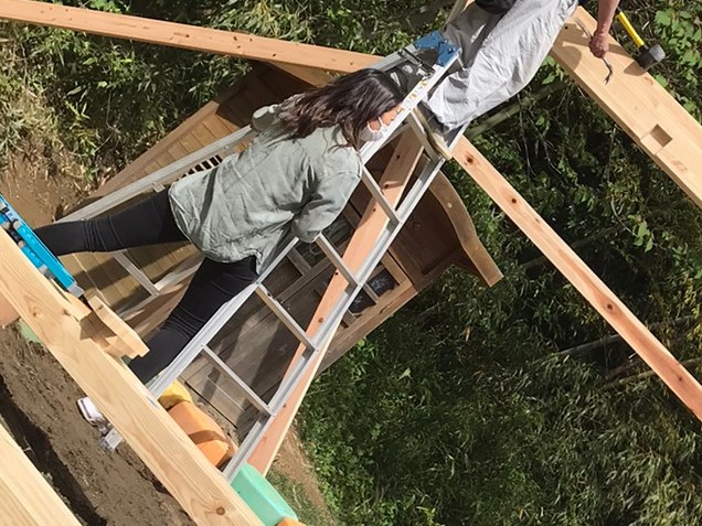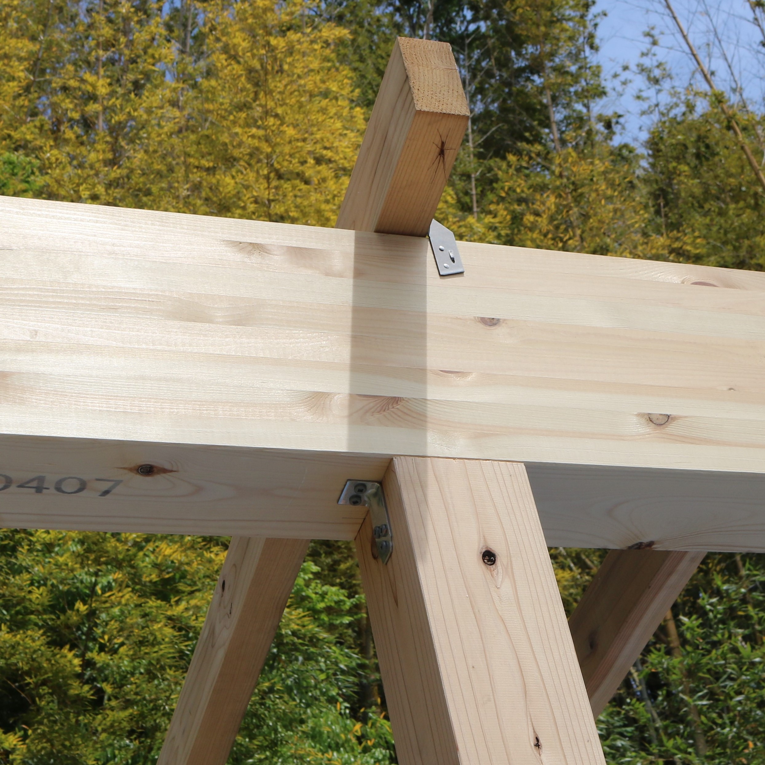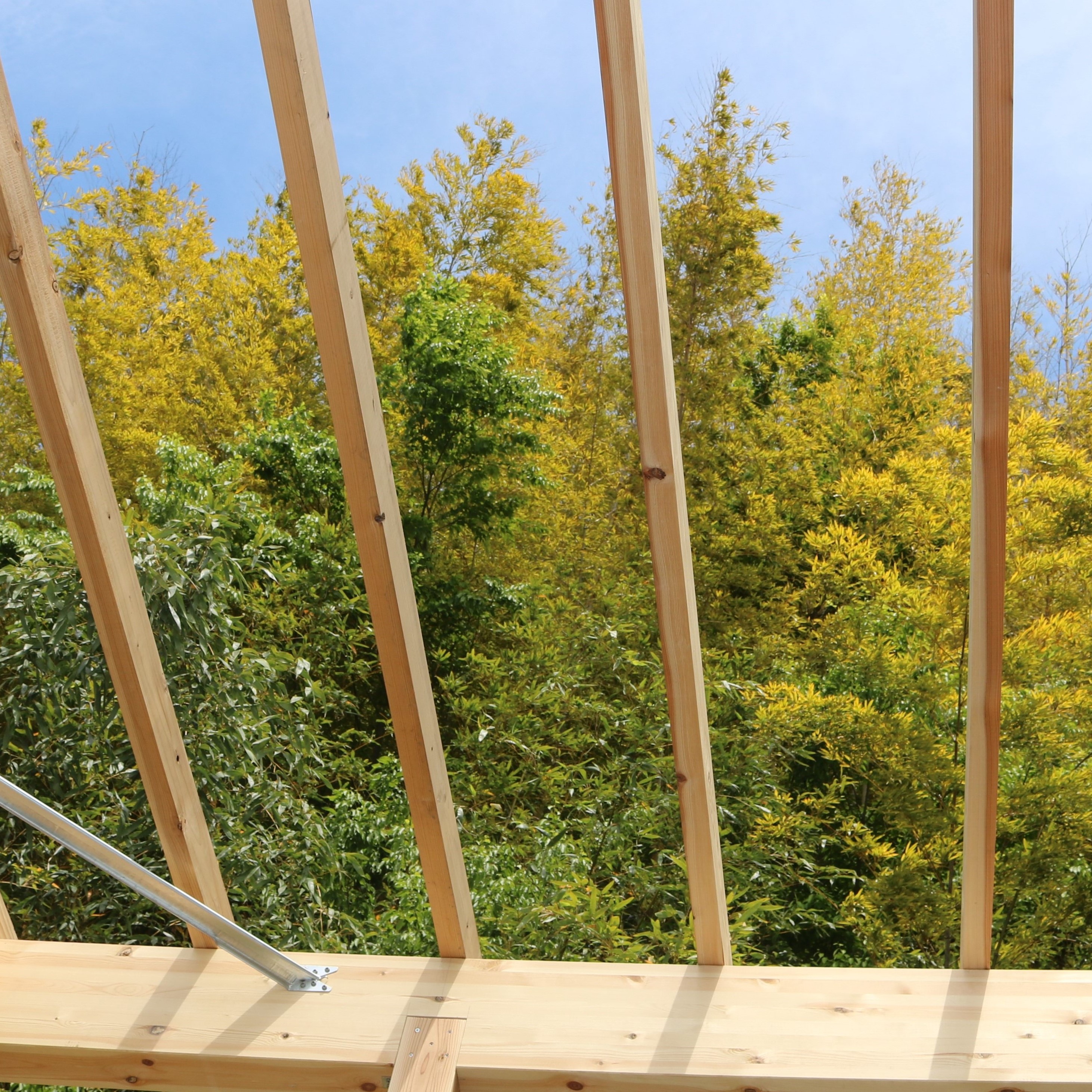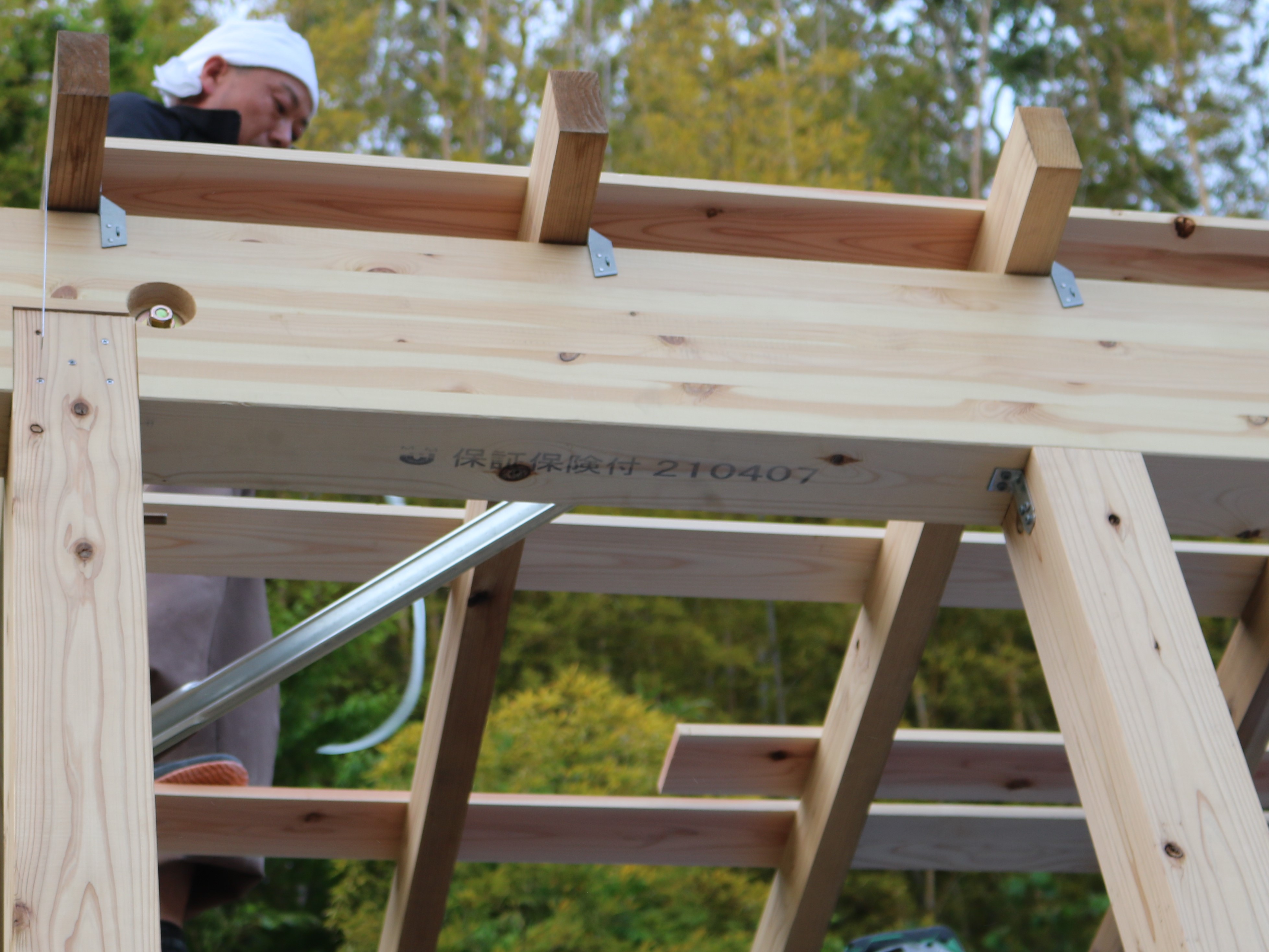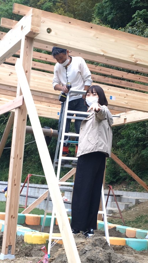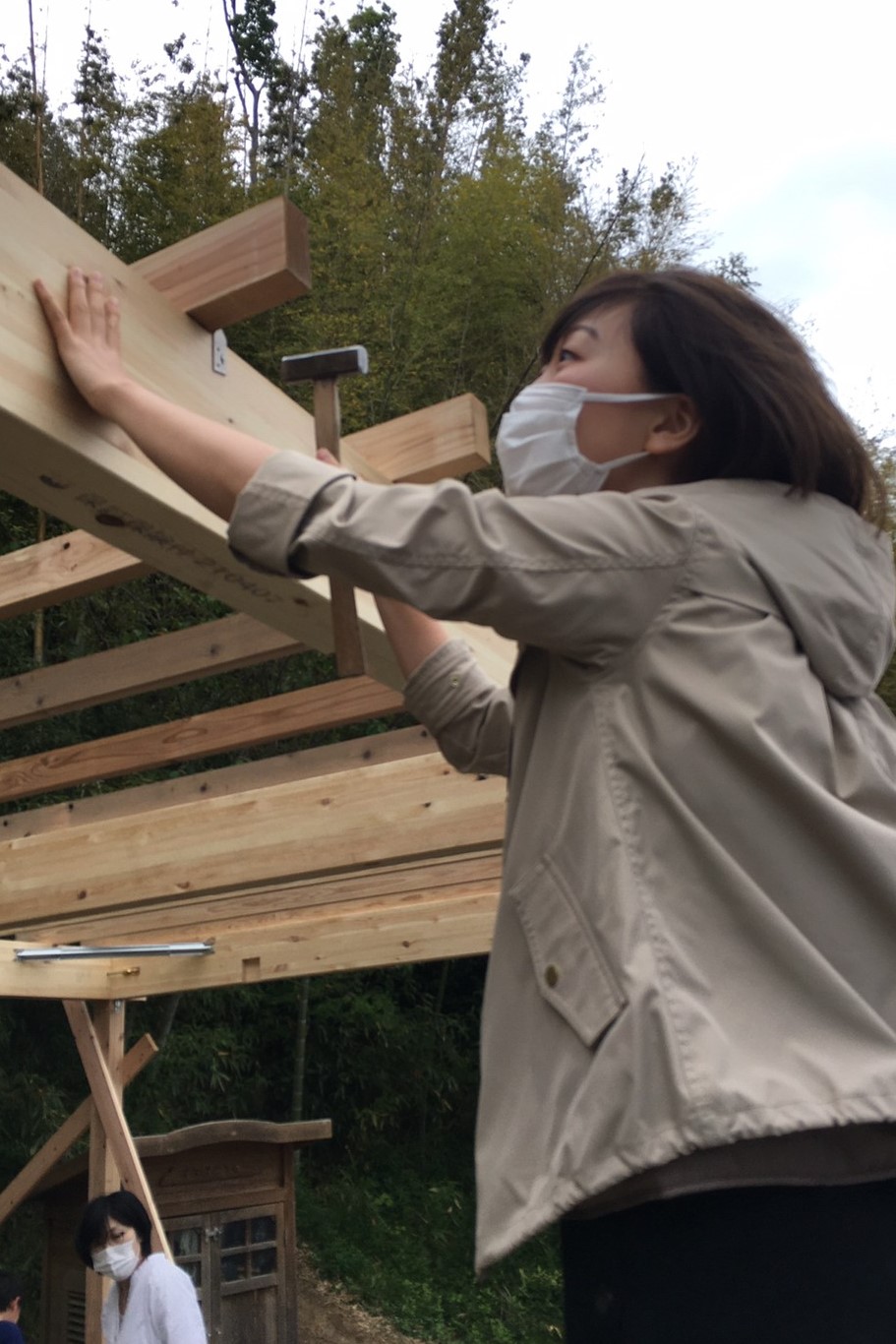沓石に柱を立て、ビスで仮に打ち付けた後、仮すじかいを2本縦と横に柱につけ、地面に安定するようにたてました。四つ角の柱の内2本の柱を、筋交いを周りに付けてバランスよく立てた後、梁(はり80キロくらいある)を2人で2つの脚立を使って、1度脚立の上まで乗せ、「せーのー!」で柱に組み付けていきました。「ありしぐち」という方法で、掘った溝にゴムハンマーで叩きながらはめていきました。重い材料を上まで持ち上げる作業は慎重に、無理しないように、片方ずつ上まであげました。同じように向かいの四つ角の2本も立て、80キロの梁を、脚立を使って横にはめ込みました。横に渡してつけてある仮筋交いは安定して危なくなくなるまで付けたままにしておきました。後の2本の横の梁も、「ありしぐち」と称する方法ではめ込んでいきました。次に四つ角の柱と柱の間に2本ずつ柱を立てていきました。その柱を立てるのは、O親方が、垂木(たるきー屋根にあたる横に渡す材料の木)を上に登って付けていくのを、T親方が担当し、2人分担して作業が進められて行きました。T親方は、梁の上をサーカスの芸人のように垂木の材料をバランスよく手に抱え、まるで普通に地面を歩くように、皆の頭の上をスタスタと渡っていました。(お~これぞプロの大工さん)という感じです。相好しているうちに、M先生、MS先生、2人の応援隊が駆けつけてくれていました。「わたしたちにできることあるのかしら~」と言いながらやってきました。きっと3人のおじさん達の頭に浮かんだのは、「いいんだよ、何もしなくても、いてくれるだけで、嬉しいんだよ❤」と、思っていたことでしょう。えっ僕だけ⁉ でも、垂木と梁を繋ぎとめる‘ひねり‘という金物を釘で打ち付ける為、脚立に乗らないと作業ができないので、それを押さえる係を手伝ってもらいました。Nさんも、頑張って打ち付けていました。「わたしもやってみたーい」と、言うので2人にもちょとやらせてもらいました。私は、柔らかい木に叩いた釘が入っていく感触を、「‘木‘も生身でいきているんだな~大切にしなきゃあ」と、感じながら打っていました。えっ僕だけ⁉ M先生は、「なんで真ん中に柱を立てないの~?」と、大黒柱的なものを想像していたようで、とんちんかんな事を言って、親方たちを笑わせてくれました。と、突然空模様が急変、黒い雲と共に、激しい雨と雷。”当地方に竜巻注意警報が発令されました”作業中断、今日はこれで解散となりました。次の日に、遊びに来ていたそうすけくんが、昨日「虹を見たよ~」と言っていたので、夕立の後16時半から17時の間出たようでした。”え~僕も見たかったな~”