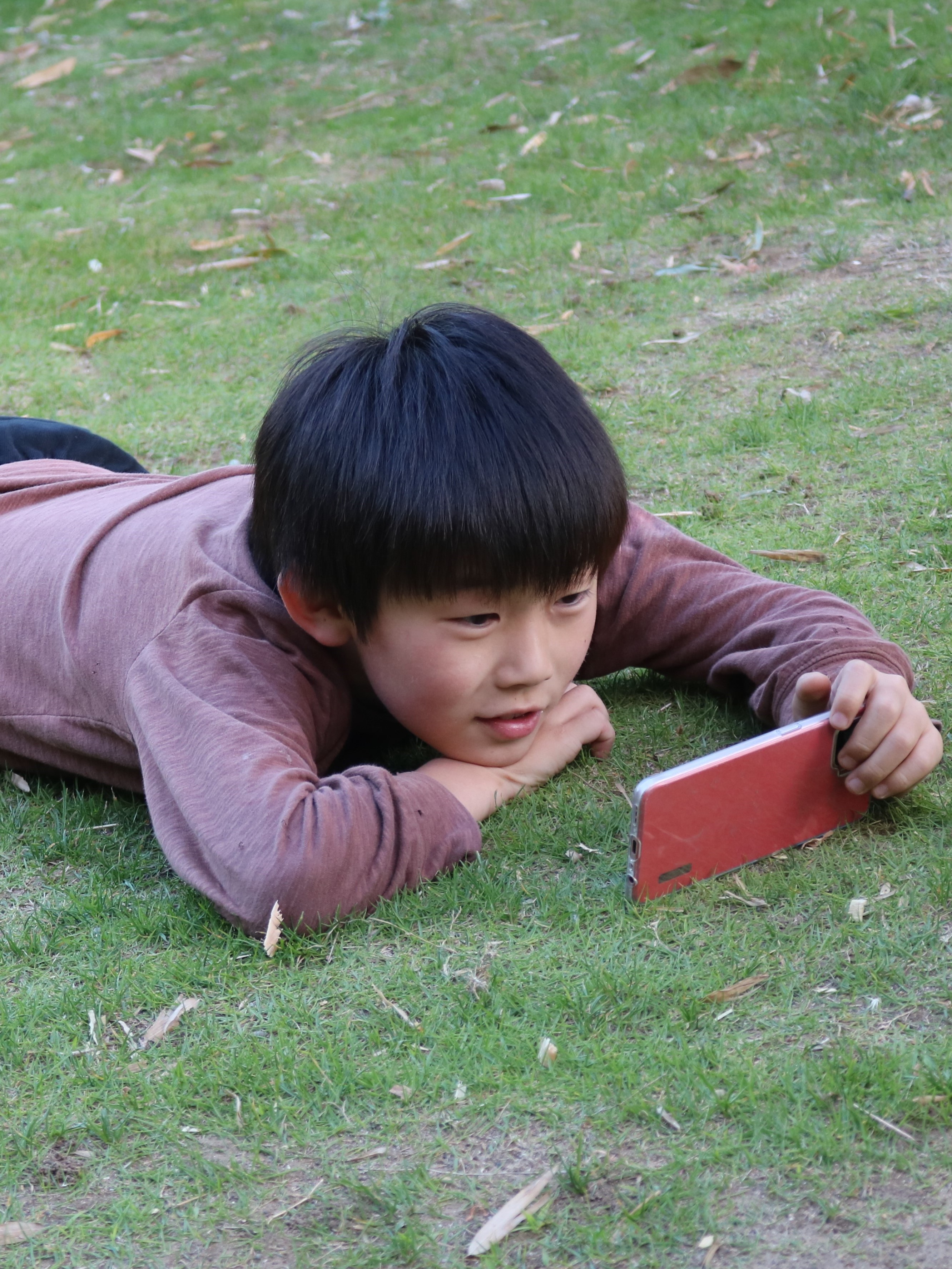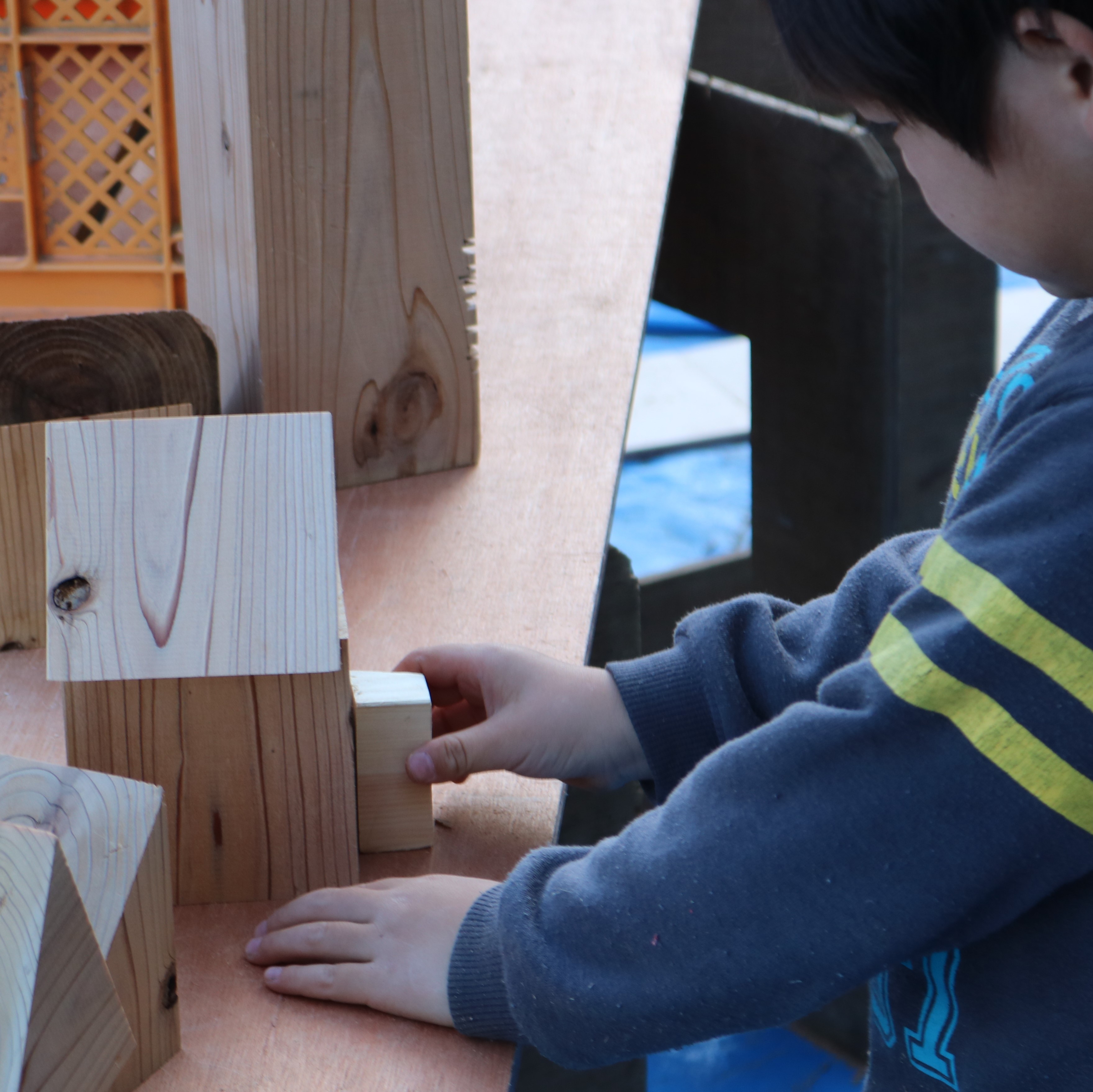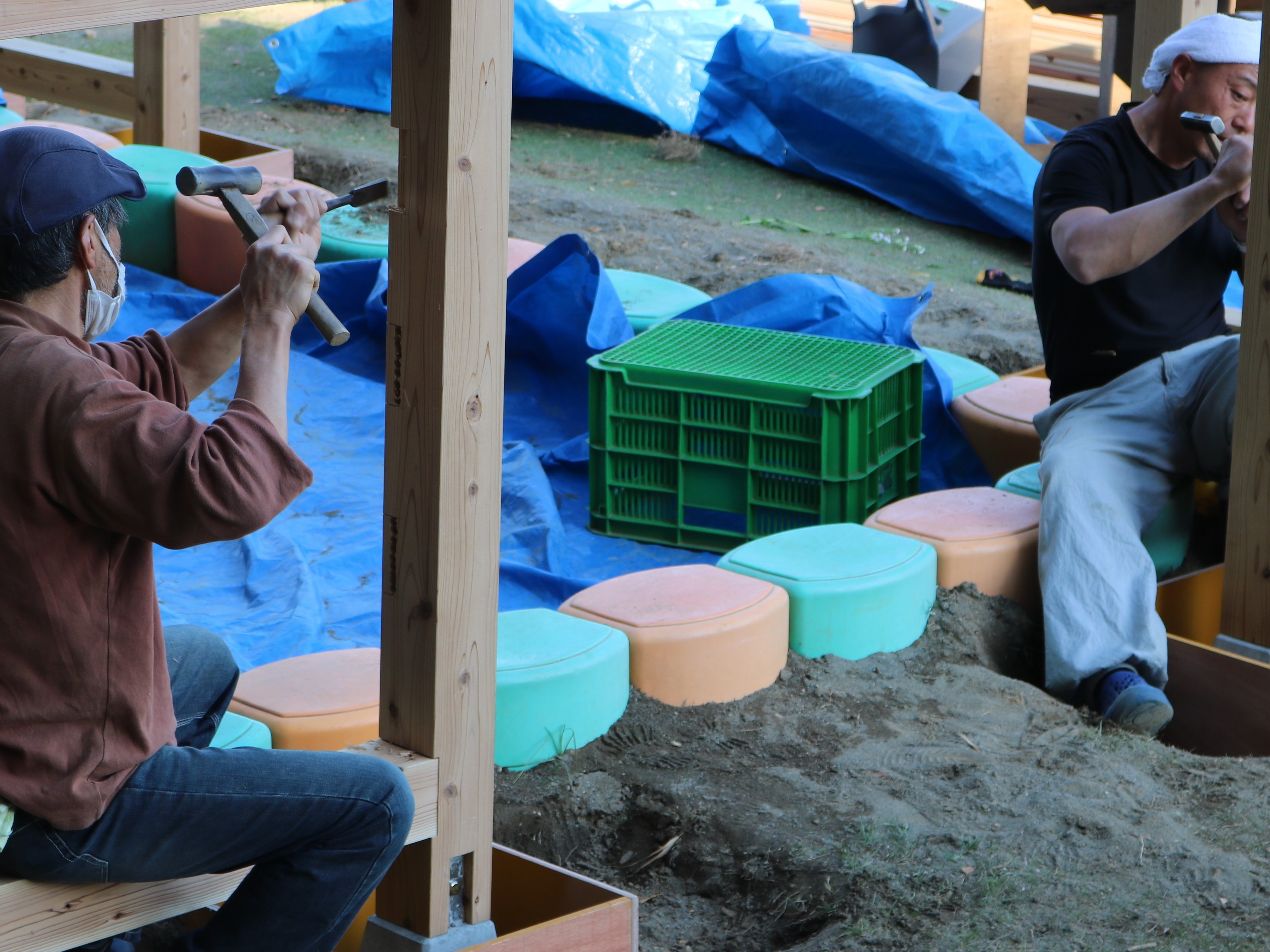 園庭ではすでに作業が始まっていて、Tさん一家(Mさん、Nさん、Uくん、Sくん、Aくん)とお父さんの会社(S社)の同僚のOさんが来ていました。お二人は会社で大工さんになる生徒に仕事を教える教官をしているそうです。私が砂場に行くと、奥さんのNさんと3兄弟の弟子の息子たちが柱を立てる地面にスコップで穴を掘り始めていました。長男の助っ人は8キロくらいあるであろう土台の沓石(くついし)まで’ん~よいしょ‘と抱き上げ、掘ったところまで運んでいました。「おー大丈夫かー?」と思わず言ってしまいました。柱は全部で12本、3人の弟子たちは、深く掘りすぎたり浅かったり…、親方たちは水平器で水平をはかりながら、何度も調整していきました。いつも掘ったり埋めたりして調整するのは、なぎささん。ちょっと大変そう。でも、土台の水平は一番大事なので慎重でした。 昼休みには、持参した菓子パンとコーヒーで済ませ、始まる時間までベンチに横になっていました。休憩大事。見上げると空は青く、雲は白く、木には緑、風が薫っていました。普段はあまり見上げない空の青さを見ながら一人だけの静かな時間を青空の下で味わっていました。昼の間に材木屋さんがトラックで材用を運んで来てくれ、午後の作業がスタートしました。