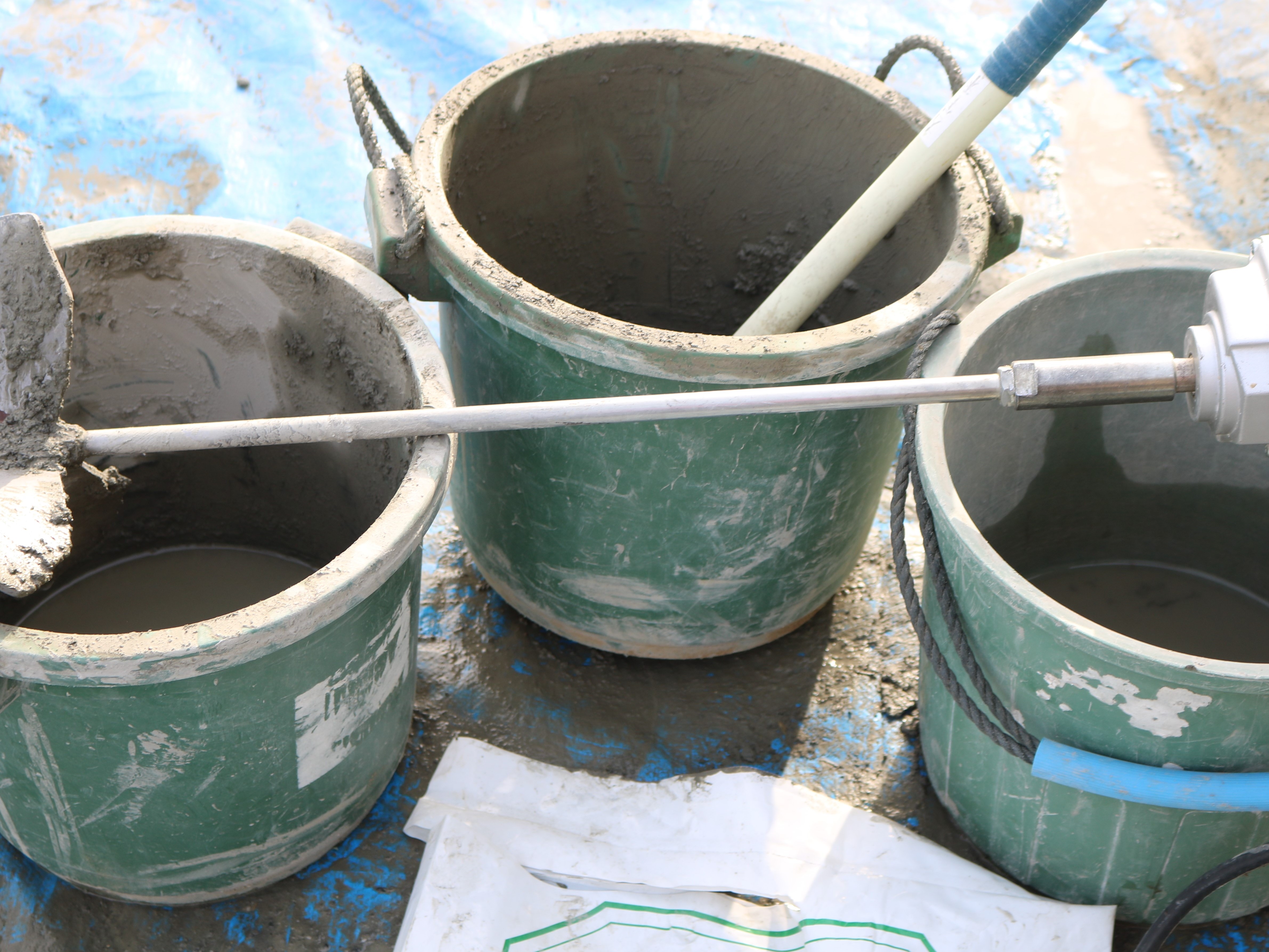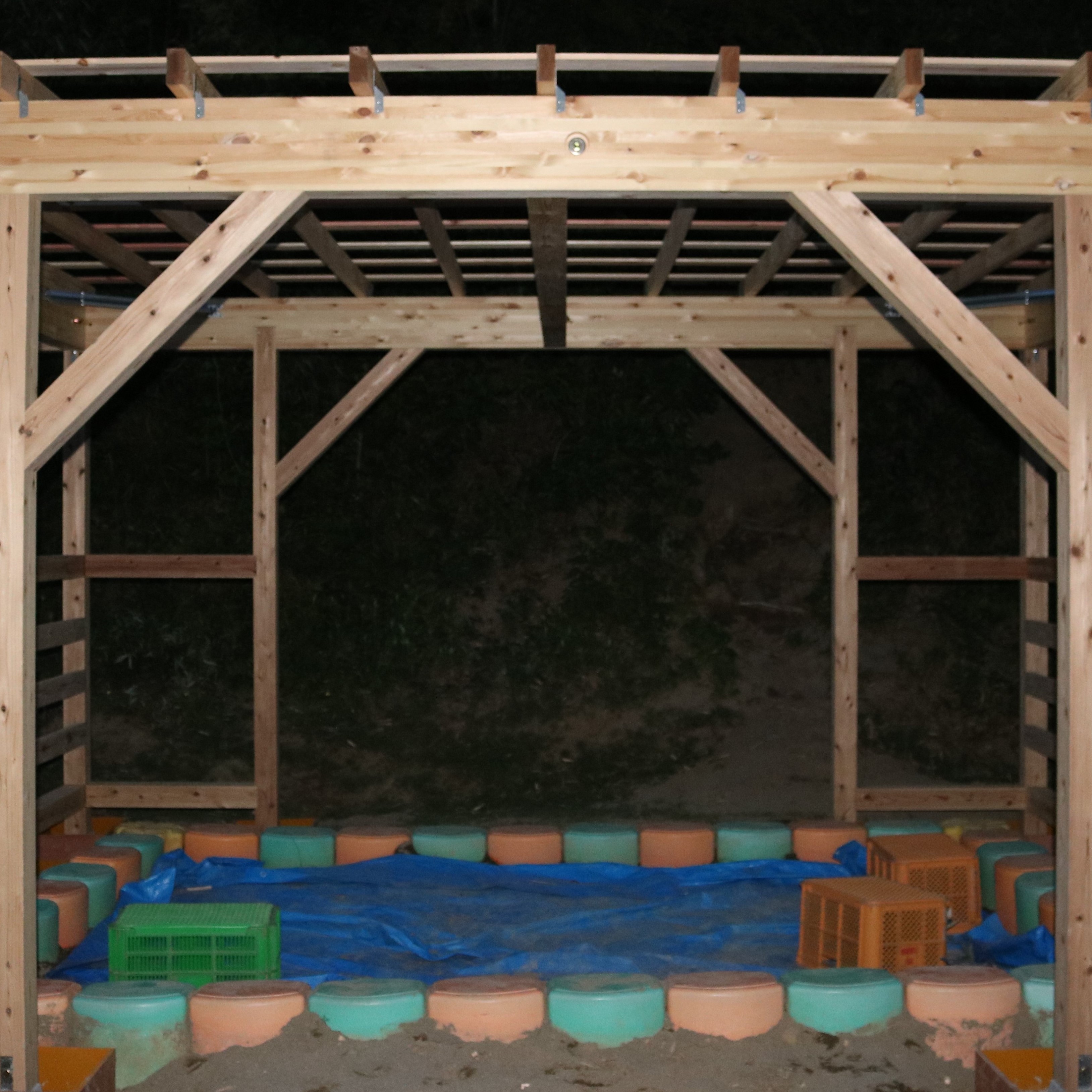 今日は朝から陽射しが暑いです。14時に集合。Aファミリーは、午前中、鎌ヶ谷の不動産屋さんに行き新しい家の打ち合わせから帰ってくる。UくんとSくんは、お父ちゃんと到着。Aくんは、コンビニでおにぎりを買って、お母ちゃんと後から来ました。親方は、階段になる板を、3か所全部で9枚を丸ノコで切り始めました。私は「面取り鉋(カンナ)」を手渡され、9枚の板の角を削りました。(いい切れ味でした。)親方は、大きな鉋で表面と裏面側面をかけました。かける方向を間違えると逆立ってしまうと教わりました。それが終わると、いよいよモルタルを型に流し込む工程に入りました。バケツに水を入れ、25㎏あるモルタルの袋から少しずつその中に混ぜていき、スクリュー3枚刃の電動ミキサーを使って、調度良い硬さになるまでかき混ぜました。足でバケツの縁を踏んで押さえ、ハンドルの所にあるスイッチを押します。少しずつスピードを上げていくと、遠心力で腕と腰に負担が掛かり、バケツが動くのを踏ん張って押さえます。初めのうちは、水とモルタルが周りに飛び散り、ズボンに掛りびちゃっとなり、そのうち混ざり始めると安定して調度よい硬さに練り上がります。固まらないうちに、10㎏位あるバケツに入ったモルタルを、沓石の所まで運び、「わんこ」という大きなおたまのようなもので沓石の周りに落としていきます。四角い小さめの木片を使って、トントン上からモルタルを叩きながら、枠の四角全面に平らになるように伸ばしていきます。まず親方が見本を見せてくれて、続いて私と渚さんが真似をして伸ばしました。親方の左官屋さんのように上手に平らにきれいにできなかったが、自分のセンスでやっていくと、だんだん楽しくなってきましたが、あまり’美’を追求するときりがなく、やり始めると途中で止められないので、夢中でやっているN母ちゃんも、兄弟たちがケンカしても、泣いていても、対応できずちょっと困っていました。それに、大人が楽しそうにやっているので「ボクもやりたいー」「オレもやってみたーい」と、当然言い出すが、”ごめんっ!手につくと大変なのでこれは触っちゃダメッ!”と、言って、3人には待ってもらいました。思ったよりも35㎝四方の枠は大きく予定の高さまで盛るのに時間がかかってしまいました。親方はモルタルを何度も作っているので、腰に負担が掛かり、きつそうに「こういうのは、本当は下っ端の仕事なんだけどな~」と、言っていました。12本の柱の土台を2周、2回ずつモルタルを伸ばして行きました。最後のモルタルを、電動撹拌機(ミキサー)をかき混ぜる作業を、下っ端である私にやらせてくれました。慣れるまで遠心力で振り回され、ズボンにモルタルがびちゃーっと跳ねました。すべて伸ばし終わると、すでに17時を回っていました。「ラストスパート!」親方は、上に登って弟子の3人に声をかけ、筋交いに用意してあった余っている10数枚の材料を、少しずつ柱まで運ぶように指示し、それを屋根となる垂木に横に渡して釘を打ち付けていきました。長さが横の端から端まで寸法が足らないので、途中で繋がなくてはなりませんでした。普通に全部同じ所で繋ぐのが「芋つぎ」互い違いに違うところで繋ぐのが「りゃんこ」と言うらしく、負担が分散されるのが「りゃんこ」の方なので、そっちの繋ぐやり方を選びました。その間、私は、初めに鉋をかけておいた残りの3か所の階段を3枚ずつインパクトドライバーで止めていきました。金のビス65㎜。前回は頭がなめてしまったけれど、今回は上手く行きました。親方が、屋根の上ですべて板を貼り終わったのが、18時位になっていました。やっと、本日をもって大まかな作業を終了しました。残った材料等を片付け終わったのが18時45分を回りました。