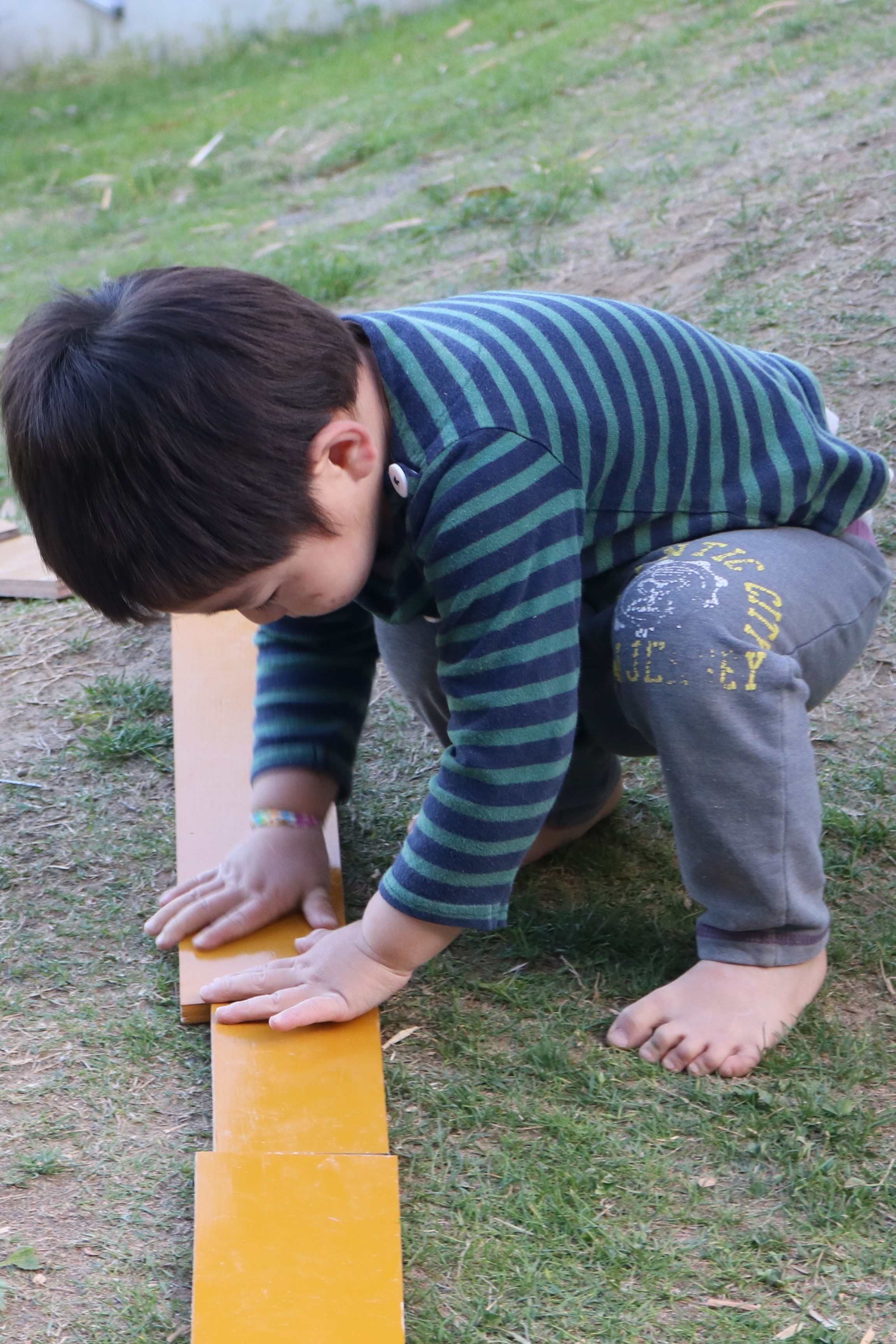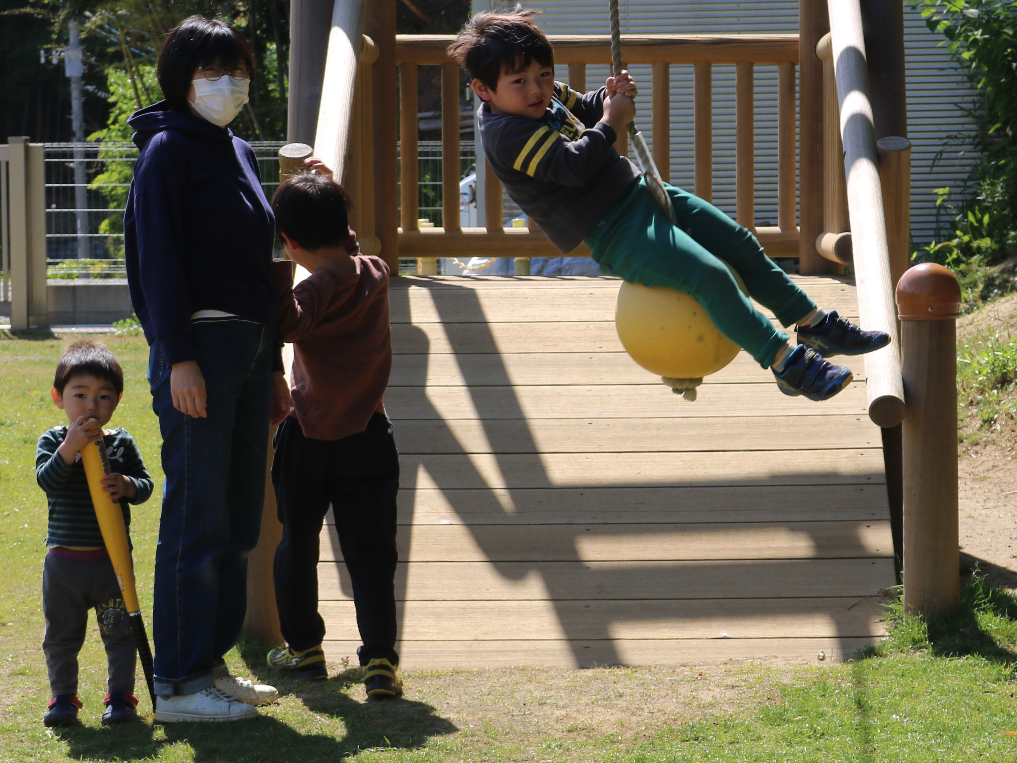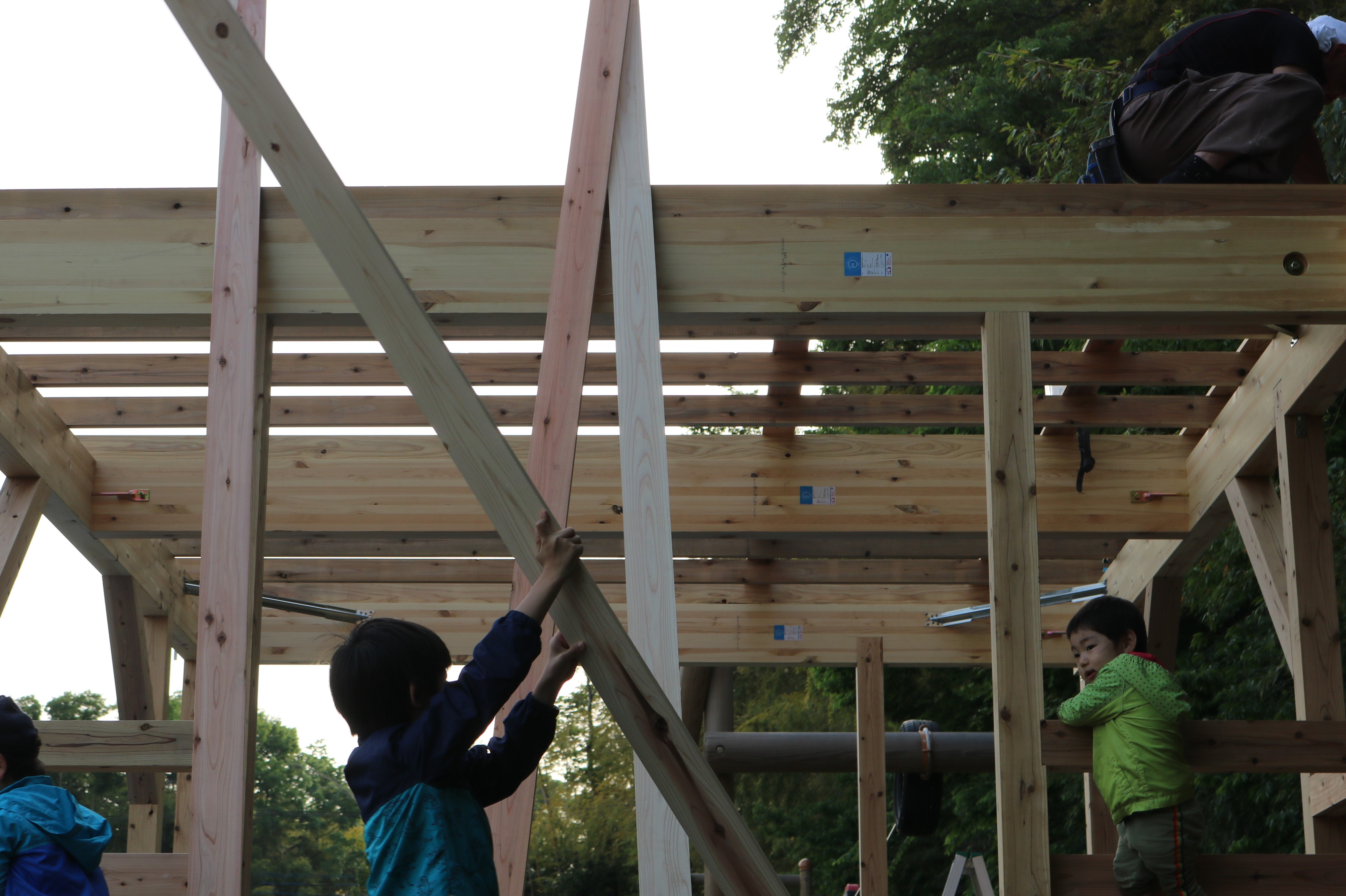 この後残っているのが、土台のモルタルの木枠を外して周りを土で埋める事と、木が腐らないためにステイン(半透明の防腐剤のようなもの)を塗る事と、鉄棒やつり革をどうやって取り付けるのかを副園長と相談する事の3つ。ステインを塗る作業は、お父さん達も集って協力を願いたいと思っています。