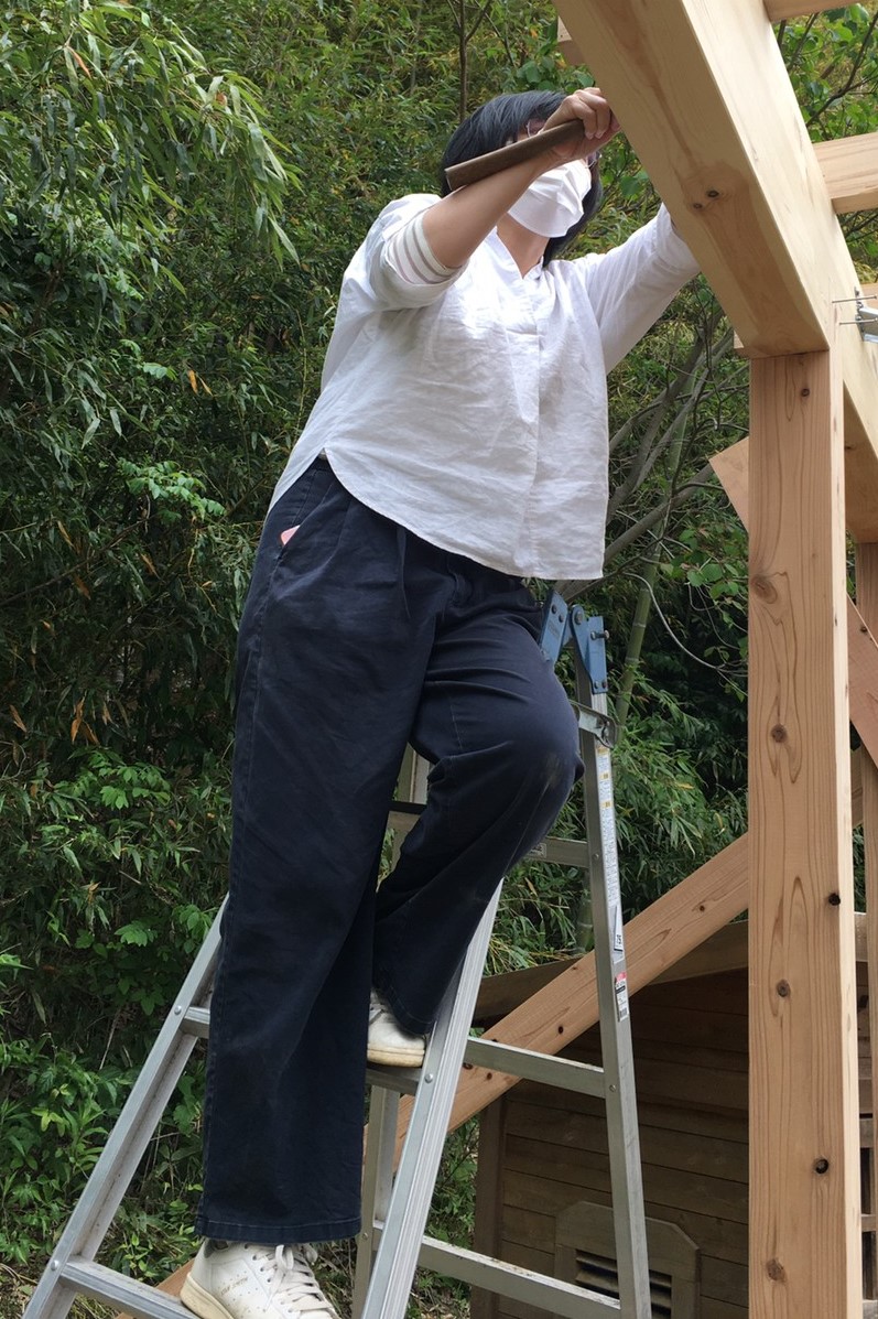 私は子どもたちと遊んだ後、N母ちゃんと一緒にモルタルを沓石の周りに入れる黄板の四角い囲いを、ドリルでビス止めした後、階段の板が柱にはまる部分を鑿(のみ)と金槌(かなづち)を使って削り取る作業をさせてもらいました。プロの道具を握らせてもらい、ちょっと緊張しました。やっぱ切れ味がスルドイ!ー(エリ役になったのを思い出しつつ・・)途中14時過ぎにまたにわか雨で一時様子を見て待機、止むと作業再開。最後に親方は、一か所だけ階段の板を3枚入れて、3人の弟子たちの遊ぶ姿を見て、ステップの幅の具合が調度いいのか確認しました。バッチグーでした!今日は18時までやりました。3人の弟子たちは、すぐにケンカが始まり、その度ごとに、「かあちゃんっー!」と奥さんは呼ばれています。かと思えば、「おい!Nーっ!」と呼ばれ何かの手伝いを求められ、お母ちゃんは、大忙し。でも、いつも笑顔の渚さんは、どこまでも優しい。理想の家族の姿をまのあたりにして、側にいるボクは、ちょっとジェラシー・・うらやましく思うのでした。