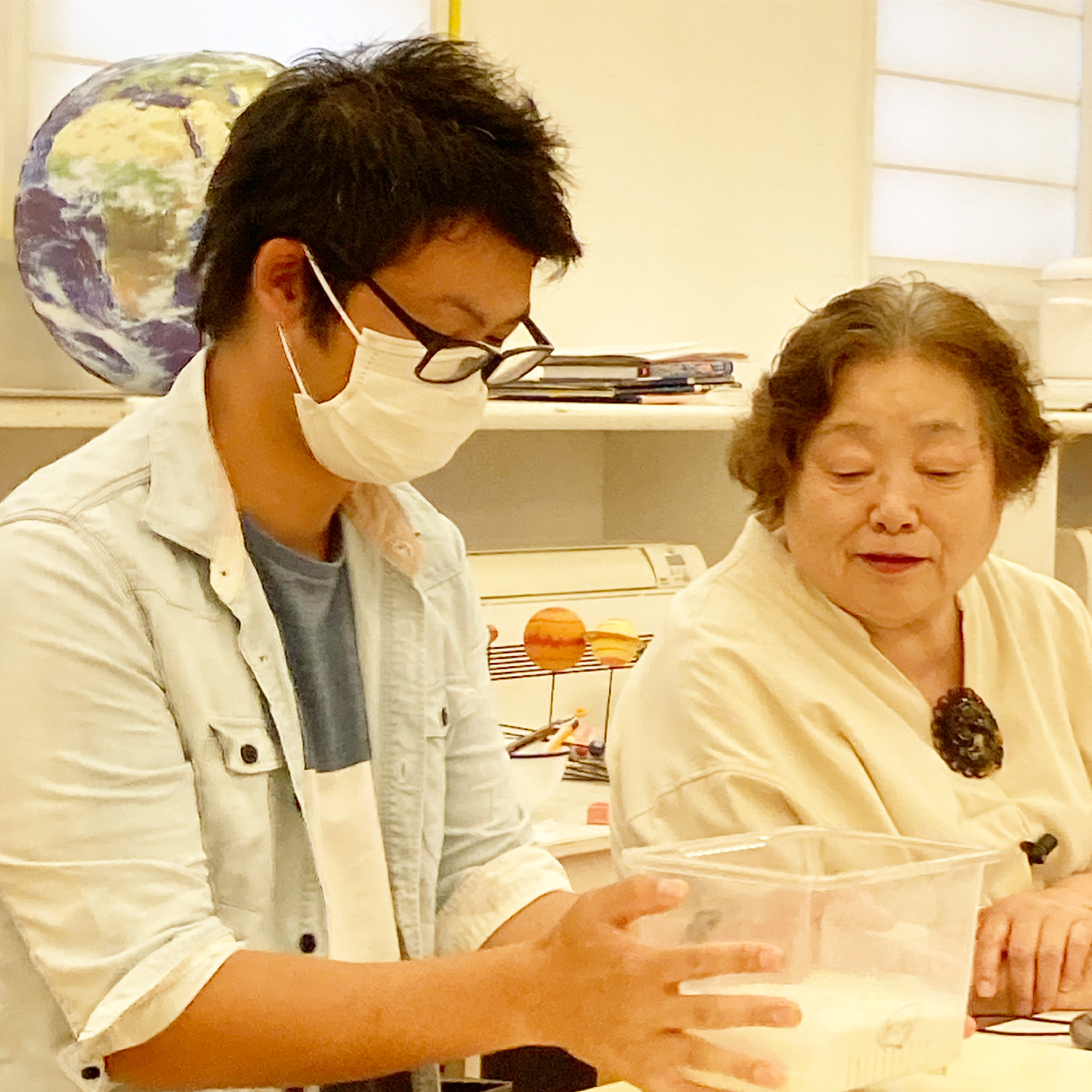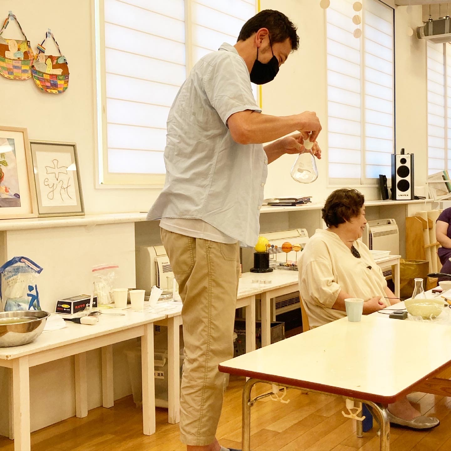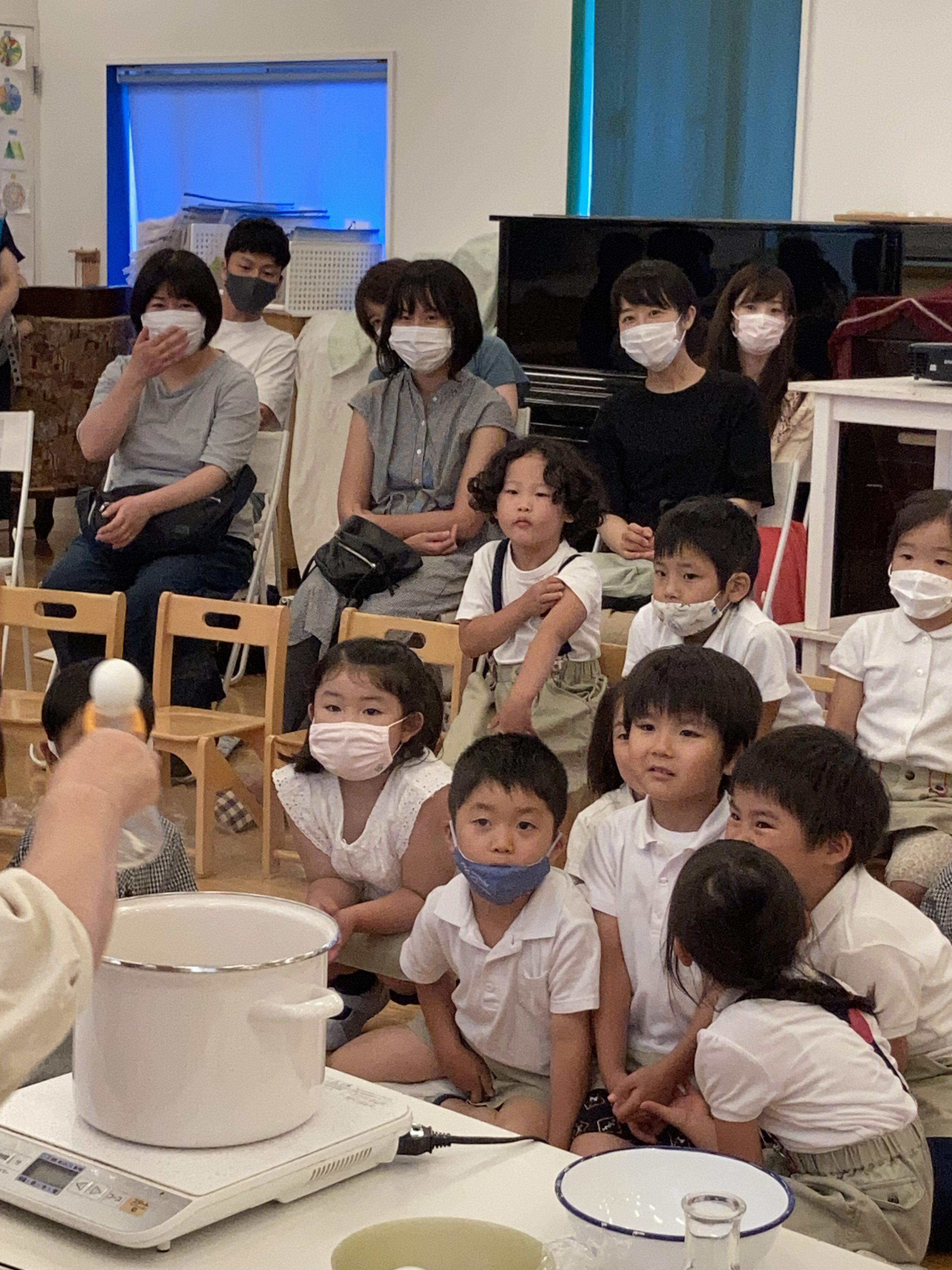 今回のテーマは、5歳児対象の「地球の歴史」「生命の歴史」に関する実験と考察という大きな目標を持っていました。実験は、1人ひとりの手に、氷を手渡し、しばらくしてから、何を感じたか?発表する体験から始まり、「星の衝突と爆発」「火に手を翳す」「ビンの中にたまご」「軽いものから順に砂の上へ」「容器が大きいほど火が消えるのが遅い」「水蒸気が雨になる」などを、お父さんたちにもお手伝い頂きながら、地球が出来るまでの歴史を体験しました。熱い’火’に実際に手を近づけたりする場面では、ちょっと、ハラハラして見ていた私でした。でも、子どもたちの集中力は、スゴイ。いつもボーっとしている私とは違って、全く心配いりませんでした。この毎回の「お仕事」が、卒園まで繋がったプログラムになっていることを、初めて知りました。後で、何でこのプログラムのことを『お仕事』というのか?‐主任に尋ねてみました。英語で、“お仕事ご苦労さま”“よくできたね”“がんばったね”を「good job(グッジョブ)」と、言いますよね。このジョブ(仕事)と同じことだよと、『「大人が仕事をして、生計を立て、生活するのと同じように、子どもも、自分ひとりの力で、生活できる力を養うため、自分を成長させる為」の「仕事」である。』と、副園長のお話でした。