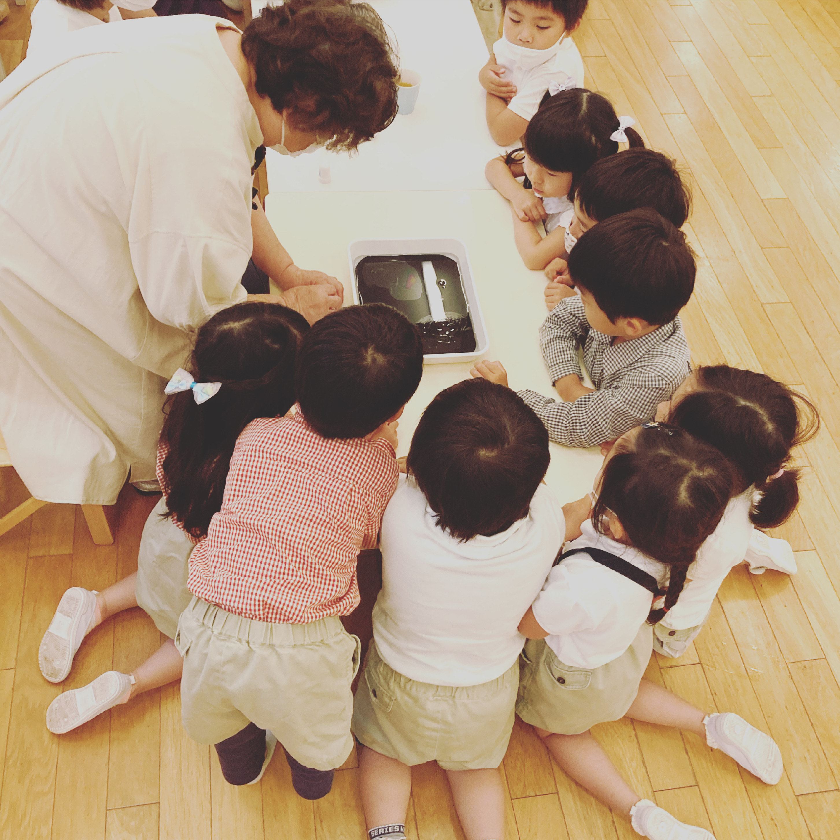 6月の研修は、土曜日に年長児の親子を招き、実験(⁈)に参加してもらいました。副園長が講師になり、子どもたちの前に座り、何やら準備を始めている時から、子どもたちの目は、興味津々の眼差しで、「この人は、いったい今から何をしようとしているんだろう?」「この先生は、これから何を僕たちに伝えてくれるんだろう?」という感じで、集中して見守っていました。 実験は、実際に目の前で、「見る」「触れる」という体験形式で進まれて行きました。