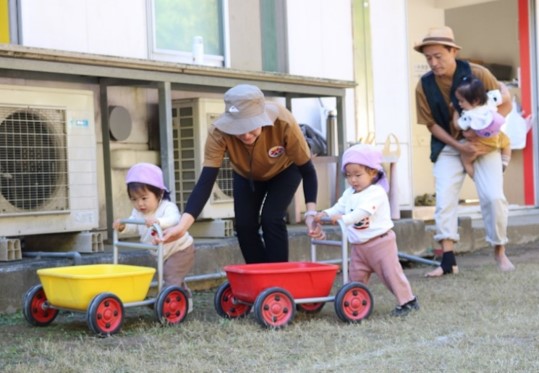 ・・・  0歳児の赤ちゃんたち3人で、岩を運ぶと、なんと、岩山が開き、