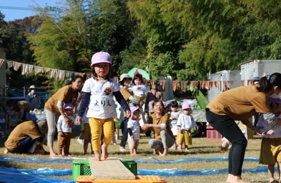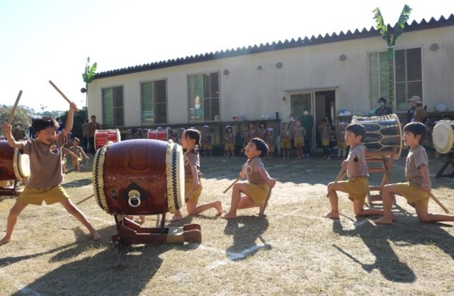 自園では、毎年例年であれば、7月に「サマーフェスティバル (夏のお祭り)」10月に「プレイフェスティバル(運動会)」が行われる予定でしたが、自粛自粛で、2つの要素を取り入れた行事として、今回、秋も深まった11月に、子どもたちと普段遊びの中で、身体を動かしながら楽しんでいる事を取り入れた内容を考え、いつもの競技メインの運動会とは異なる、一味違ったプログラムになりました。