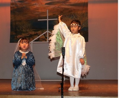 ・・・・ナレーター、ヨセフ、マリア、大天使、星、天使、羊飼い、宿屋、博士に扮した子どもたちが順番に登場します。