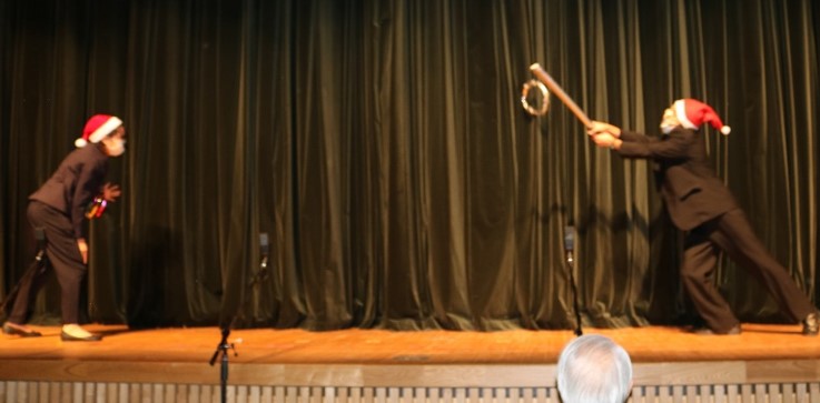 ・・・・サンタの帽子をかぶった黒ずくめの先生2人が、「ザ・ドリフターズ」の ’ひげダンス’ の曲に合わせて登場してきました。