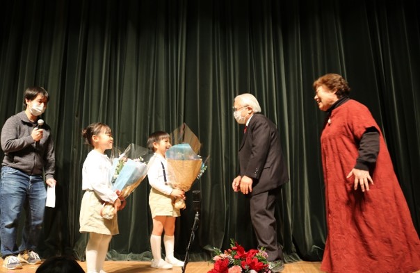 ・・・ 後援会会長 Tさんによる挨拶の後、マリア、ヨセフ役だった、SちゃんとHくんが代表で、園長、副園長に、お礼のプレゼントが手渡され、すべてのプログラムが終了です。