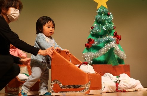・・・子どもたちの大好きな絵本をそのままに、コマドリの兄弟が(絵本では1羽)寒さに凍えている、それぞれの動物に扮した子どもたちに、自分のベストを着せてあげていきます。最後は自分が、裸んぼうになってしまい「どうしよう?」といったところに、サンタクロースとその奥さんが登場。赤いベストをもらえるという、心温まるお話です。