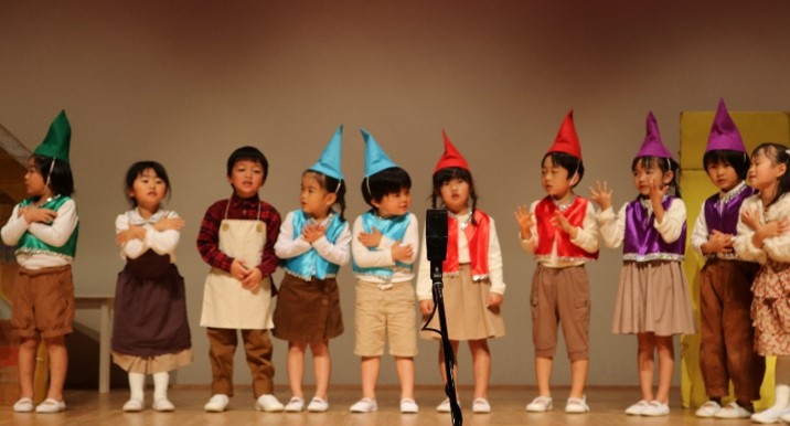 貧しい靴屋さんのところに、小人さんたちが来て、靴を作ってくれます。そして、それが大売れ。その恩返しに、靴屋さんが、それぞれ人数分の帽子とベストをプレゼントする例のお話しです。これまたカラフルな衣装を纏い、本物の「こびと」になって、楽しく演じきっていましたね。😊😊